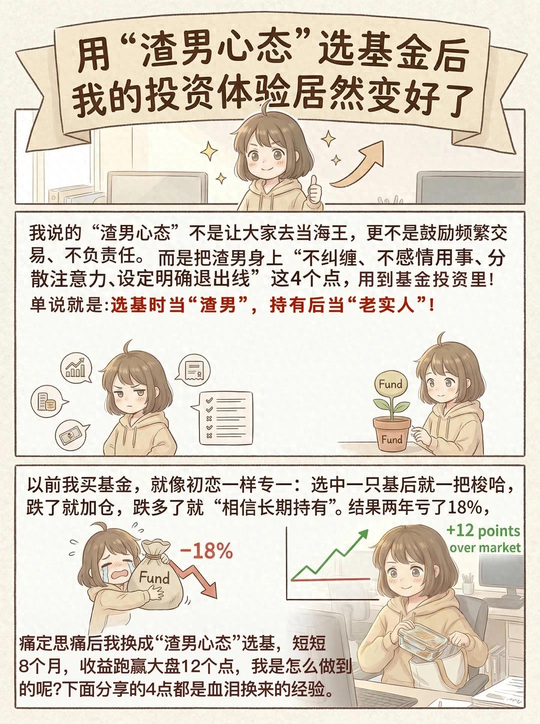 后来我换了思路——用“渣男心态”选基,持有后当“老实人”。短短8个月,跑赢大盘12个点。四招血泪经验,分享给你。