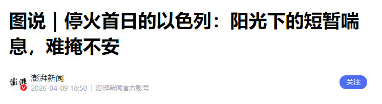 图说|停火首日的以色列:阳光下的短暂喘息,难掩不安 澎湃新闻 2026-04-09 18:50 澎湃新闻官方账号