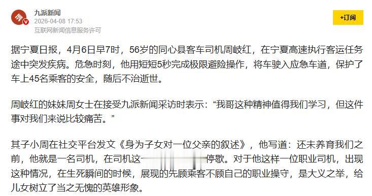 而周师傅的儿子,则在社交平台发文悼念父亲,他在文中写道:还未养育我们之前,他就是一名司机,在司机这一条道路上从未停歇。对于他这样一位职业司机,出现这种情况,在生死瞬间的时候,展现的先顾乘客不顾自己的职业操守,是大义之举,给儿女树立了当之无愧的英雄形象。
