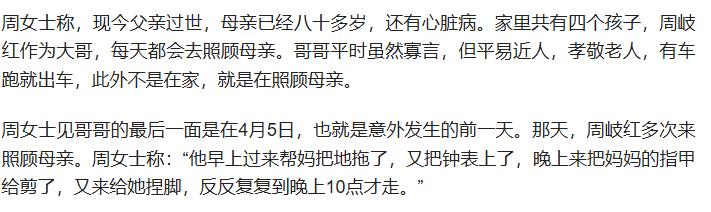 周师傅的家庭条件不算富裕,父亲去世母亲已经八十多岁还有心脏病,周师傅作为大哥,每天都会去照顾母亲,在出事前一天,周师傅曾多次看望母亲,不仅把地拖了,晚上还把母亲的指甲剪了,还给母亲捏脚,一直到晚上十点才走。