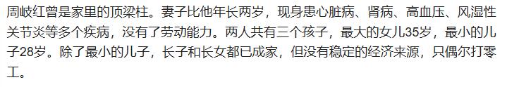 而周师傅的家庭情况也不好,妻子比周师傅大两岁,患有心脏病、肾病、高血压、风湿性关节炎等多个疾病,没有了劳动能力。