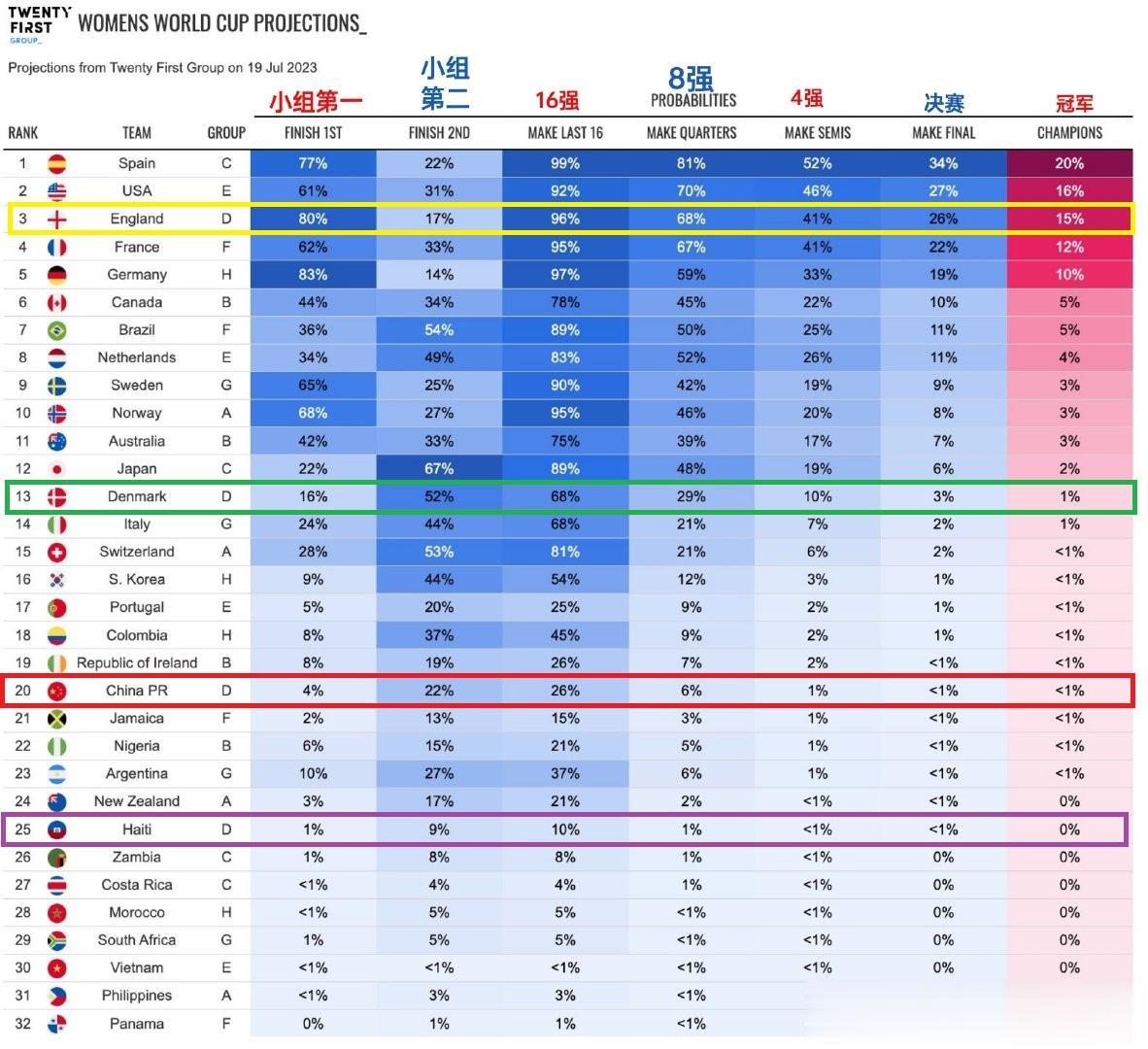 至于小组出线概率,中国女足远低于直接竞争对手丹麦队。