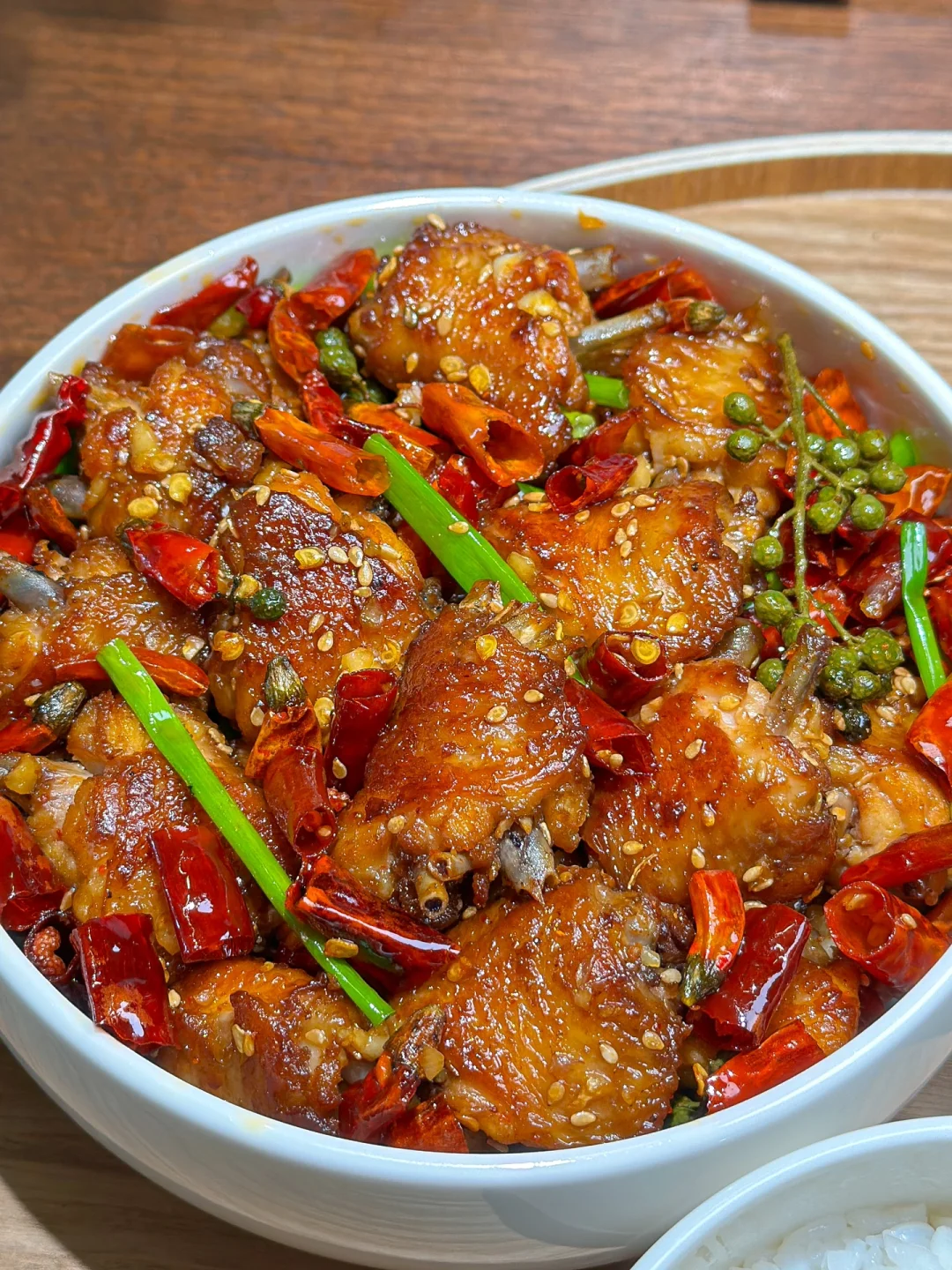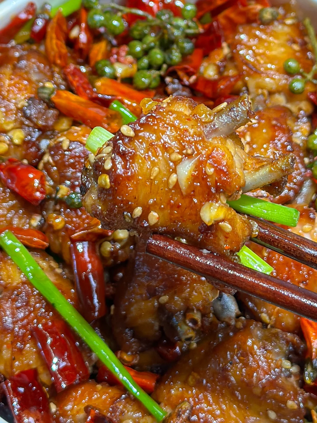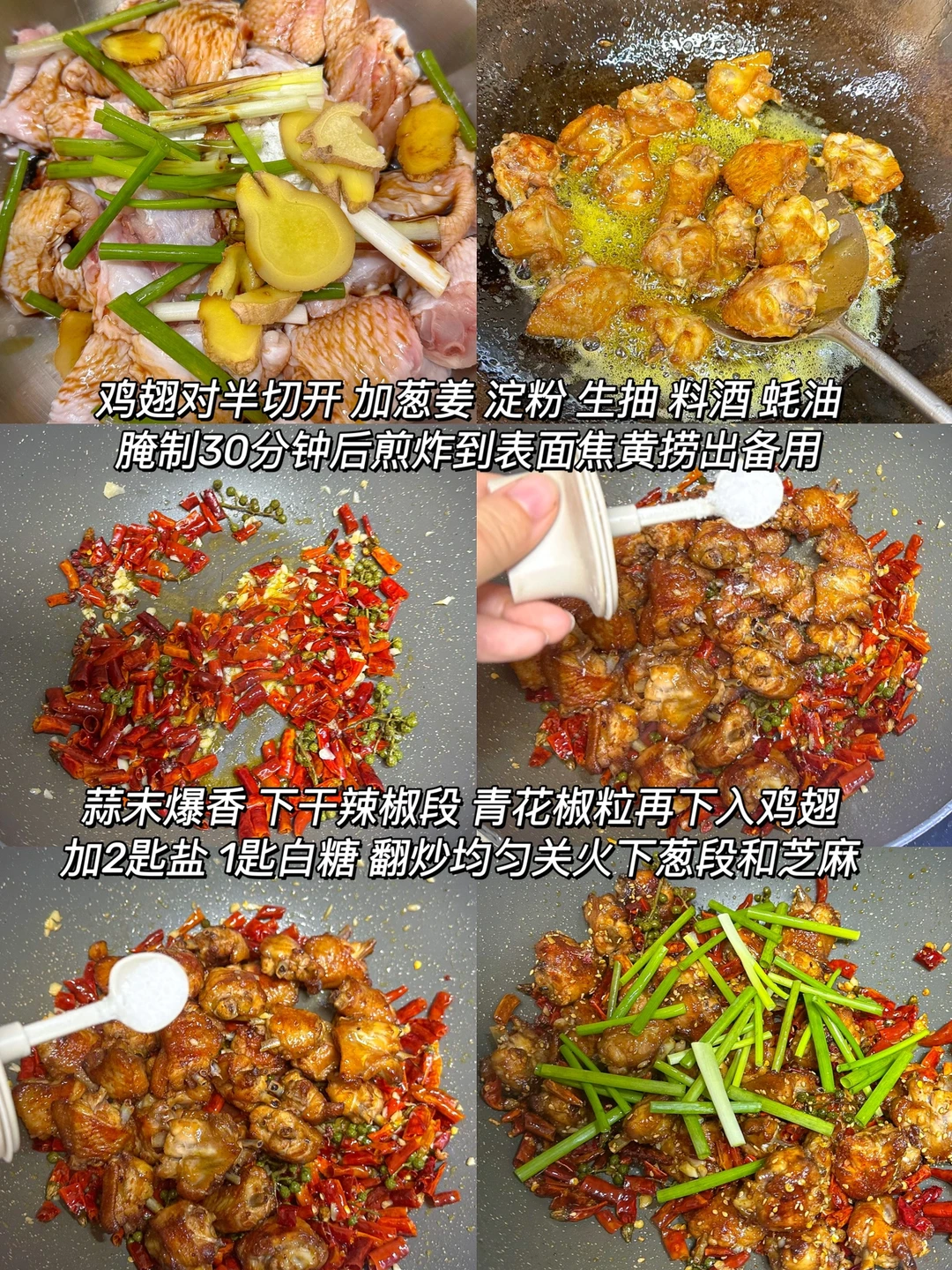2️⃣蒜末爆香 下干辣椒段 青花椒粒再下入鸡翅,加2匙盐1匙白糖翻炒均匀关火,下葱段和芝麻