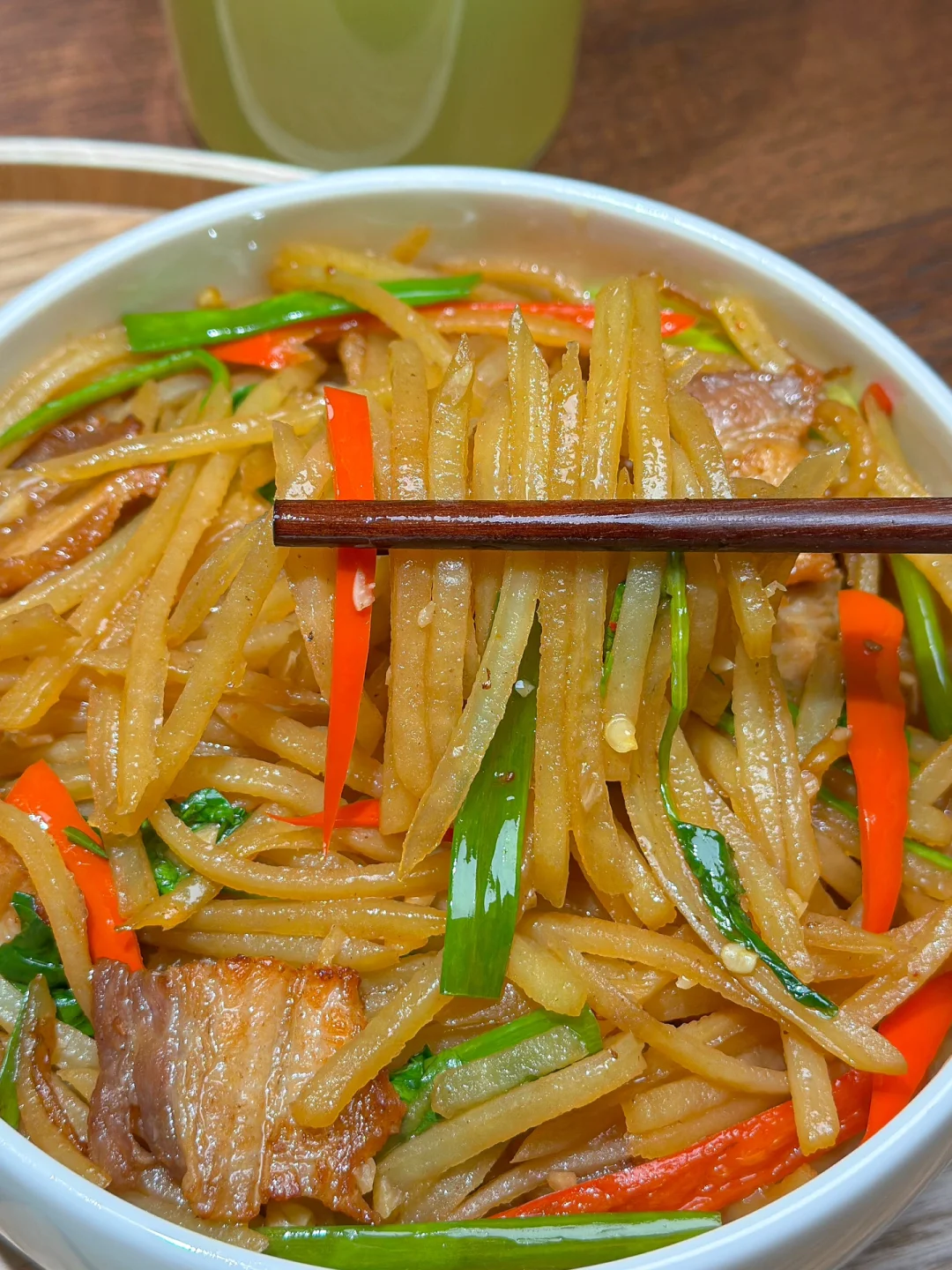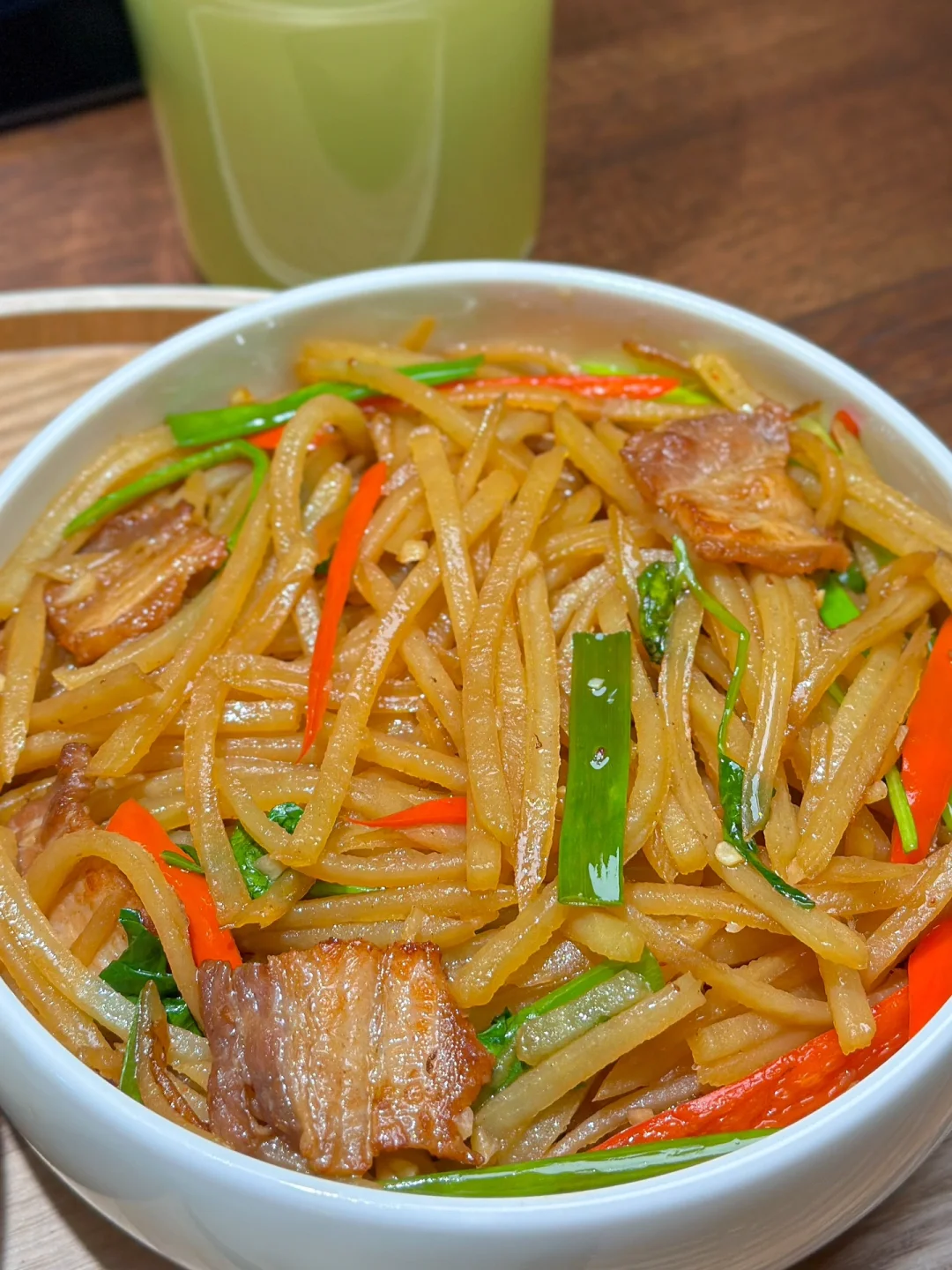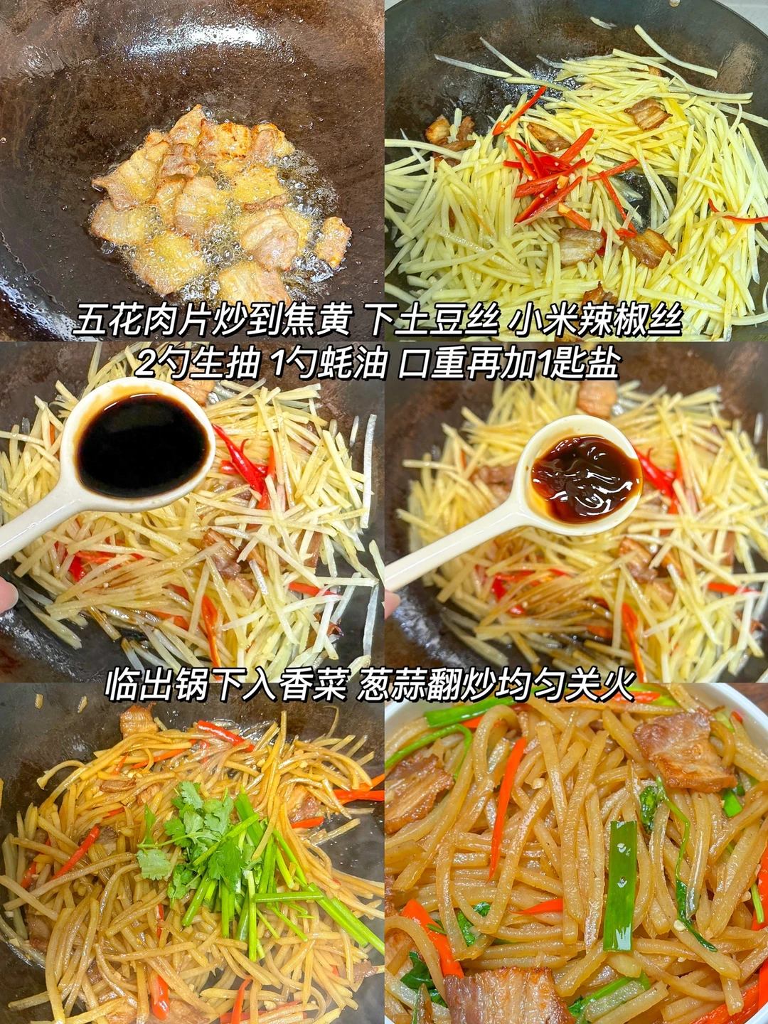 1️⃣ 五花肉片炒到焦黄下土豆丝小米辣椒丝,2勺生抽1勺蚝油 口重再加1匙盐