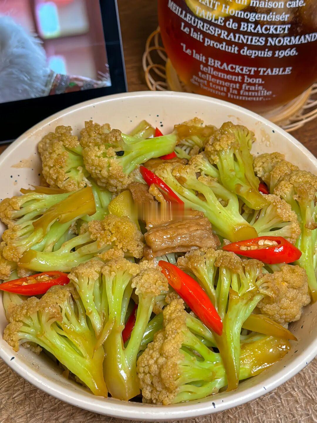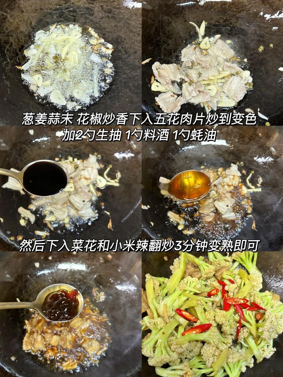 干煸菜花:菜花 五花肉 葱姜蒜 花椒 小米辣