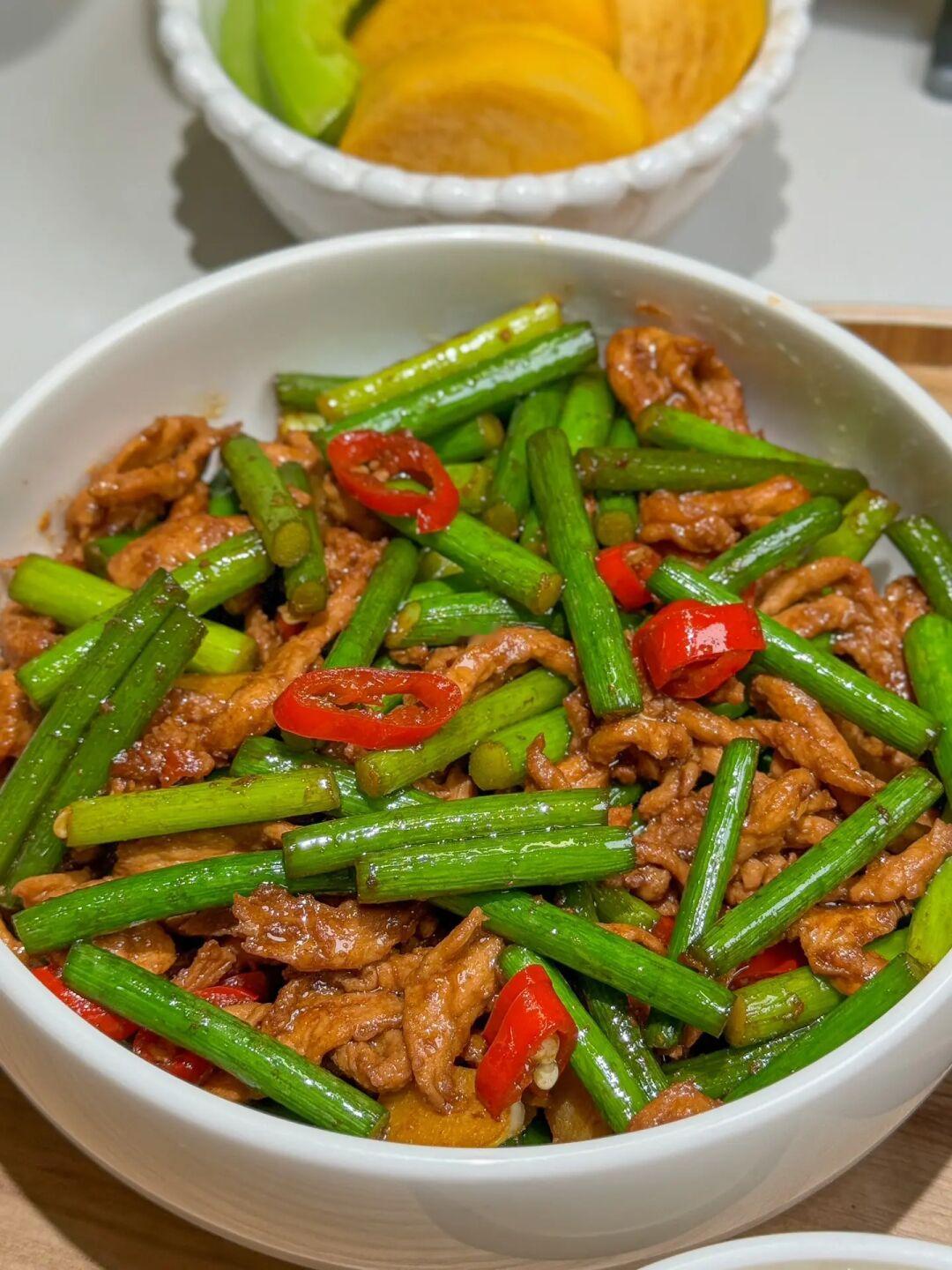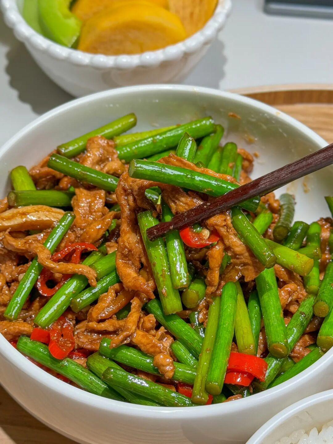 ❶蒜薹炒肉
