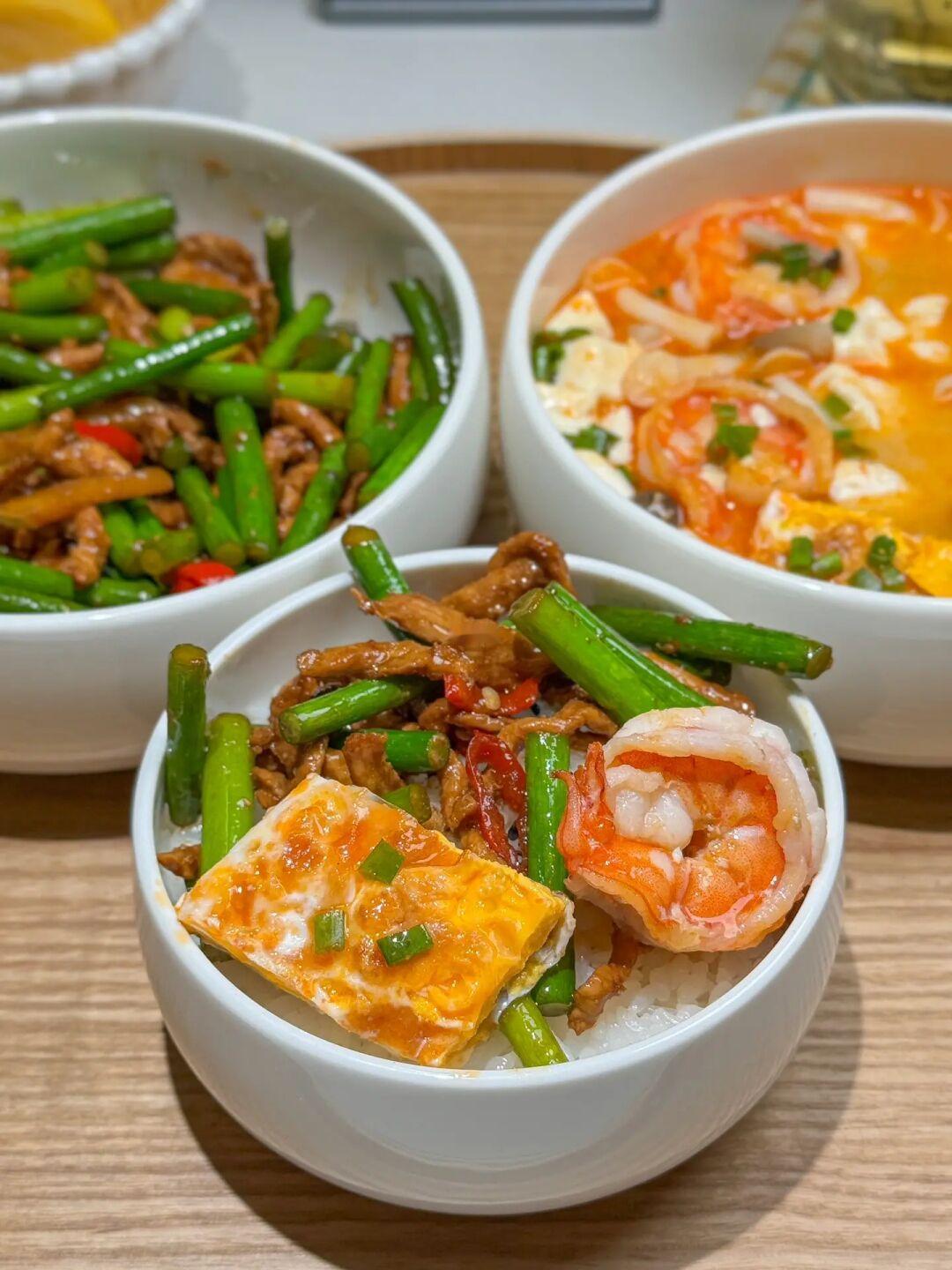 🥢一人食| 蒜薹炒肉丝·鲜虾豆腐菌菇汤🍲