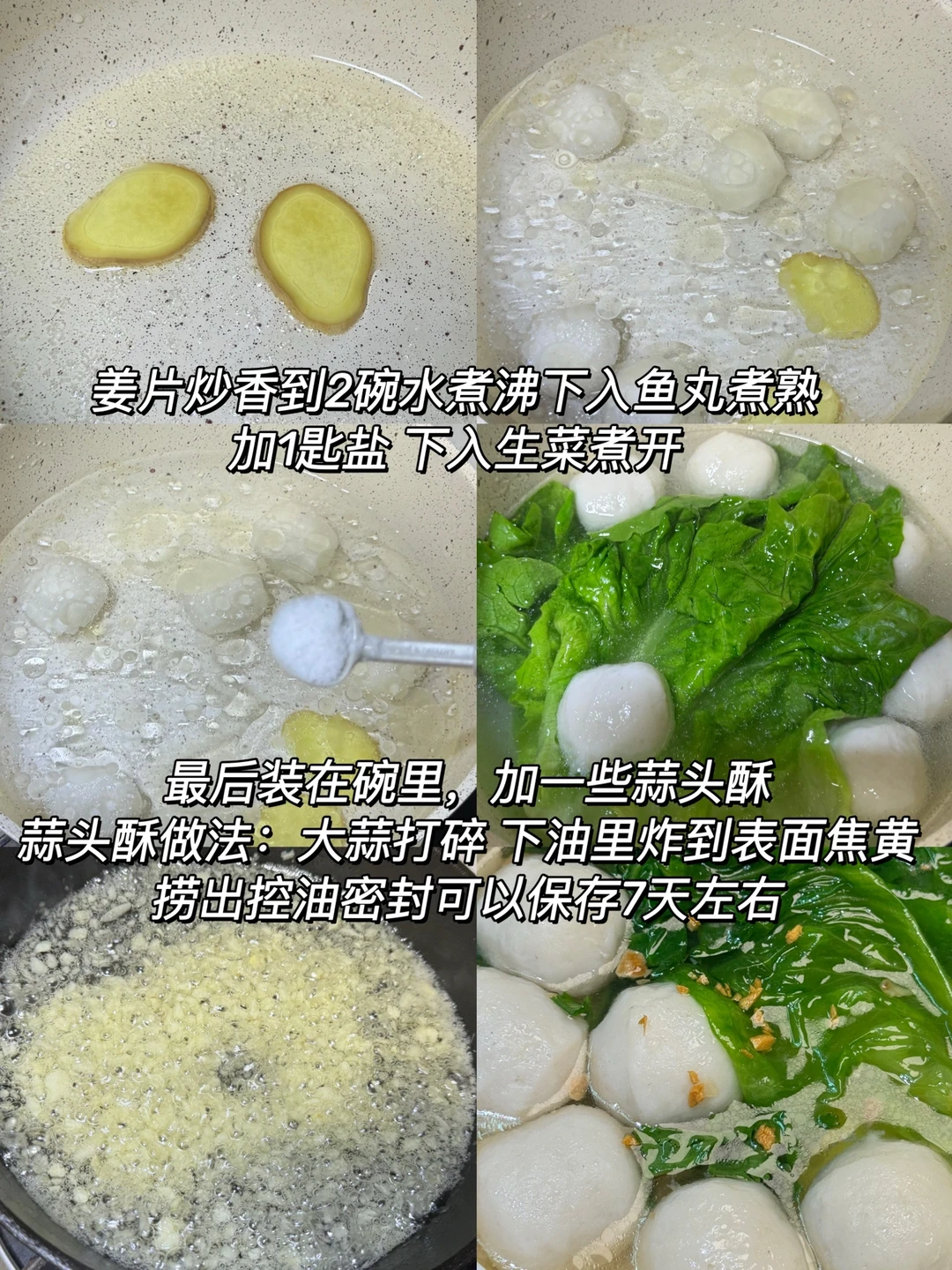 1️⃣姜片炒香到2碗水煮沸下入鱼丸煮熟