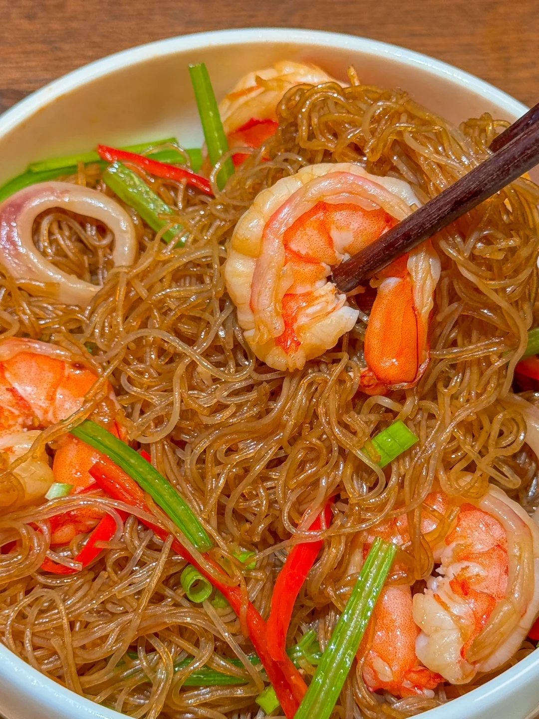 3️⃣加入提前焯水的虾仁和鱿鱼圈、芹菜 红椒丝淋入料汁翻炒均匀