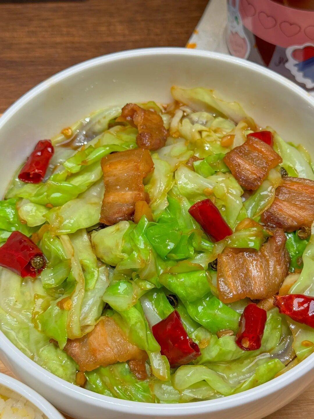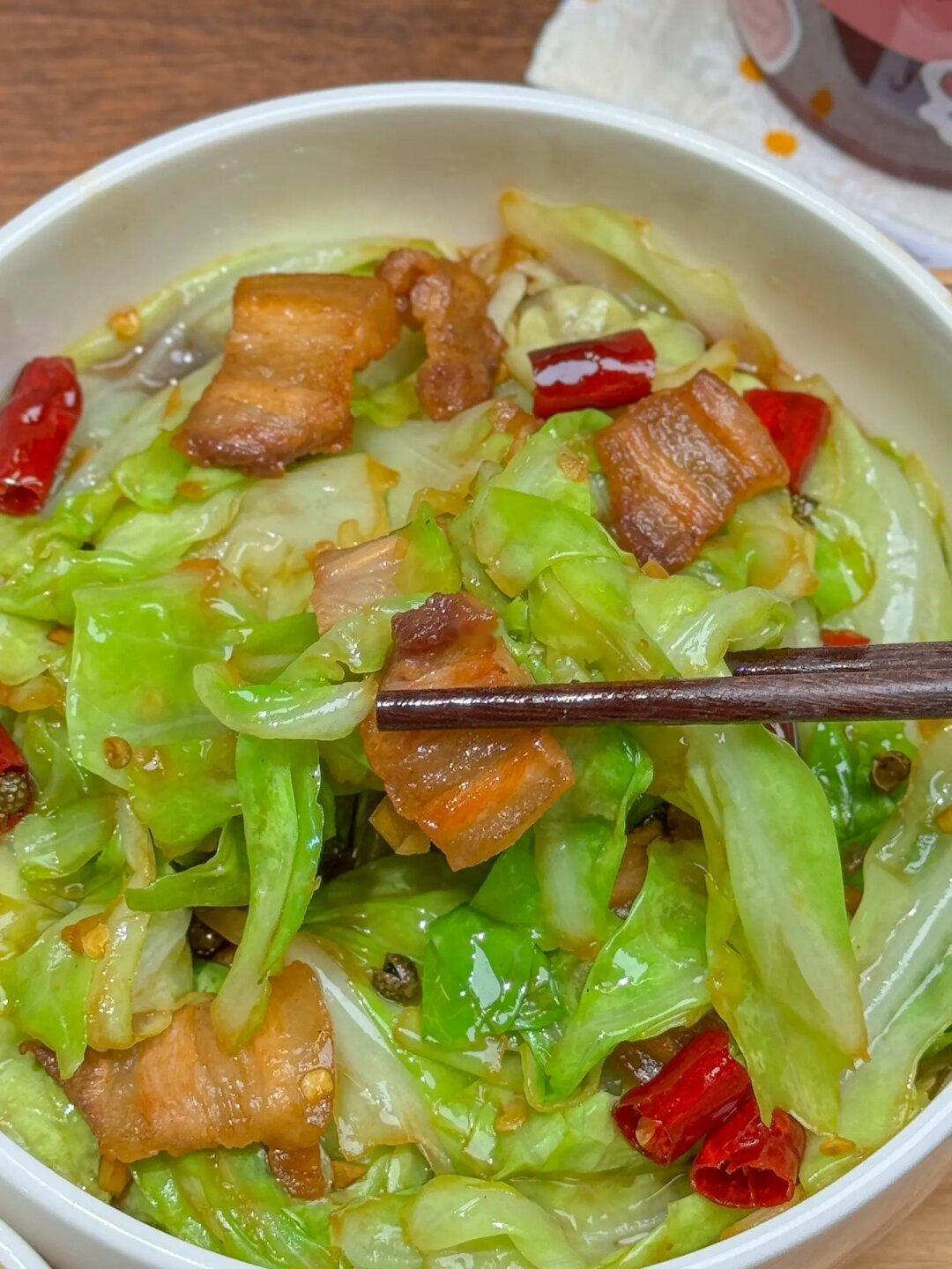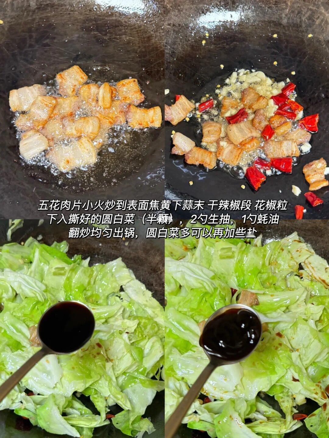 1️⃣五花肉片小火炒到表面焦黄下蒜末 干辣椒段 花椒粒下入撕好的圆白菜(半颗)