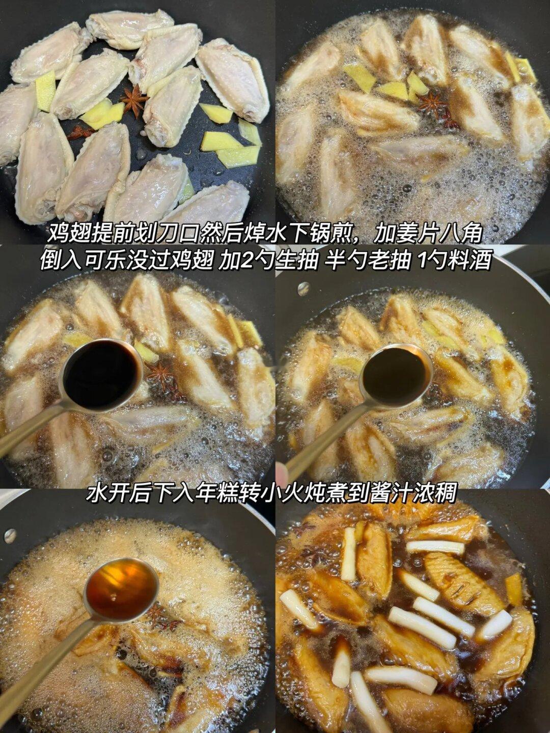 1️⃣ 鸡翅提前划刀口然后焯水下锅煎,加姜片八角倒入可乐没过鸡翅