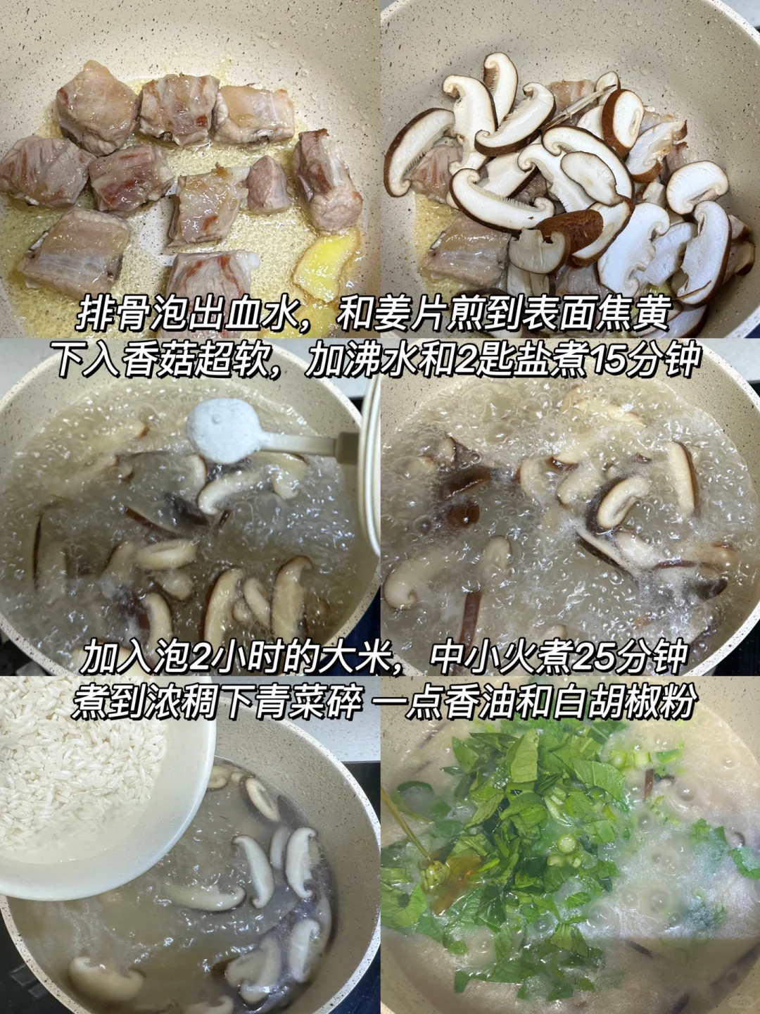 1️⃣排骨泡出血水,和姜片煎到表面焦黄,下入香菇炒软,加沸水和2匙盐中小煮15分钟