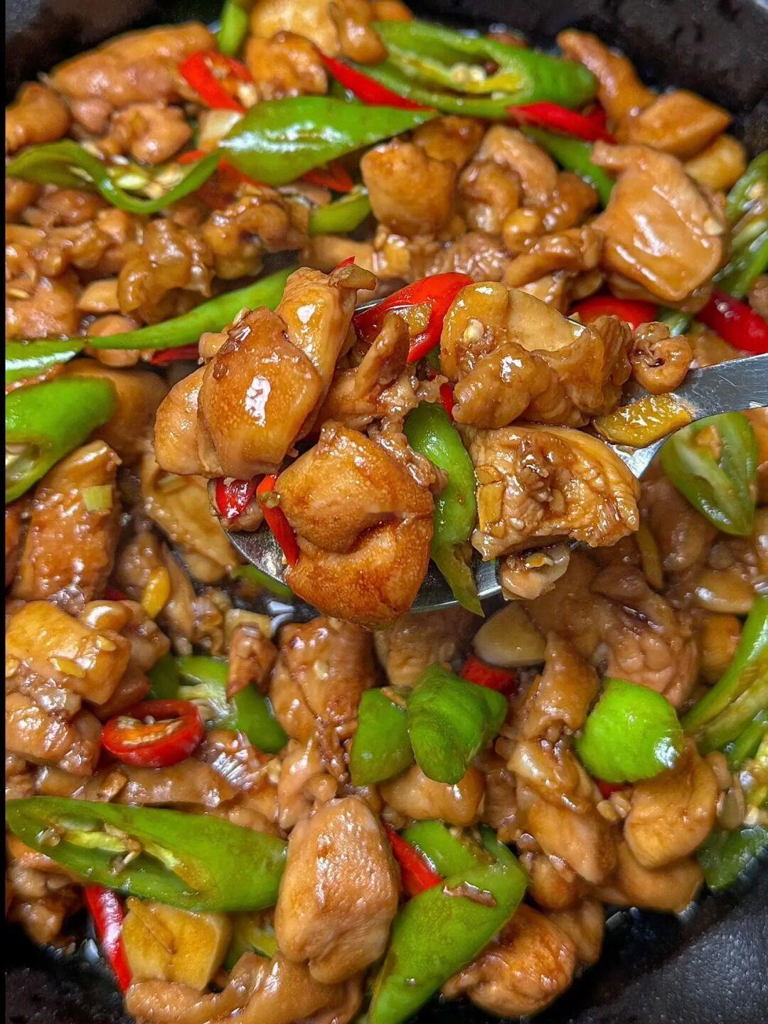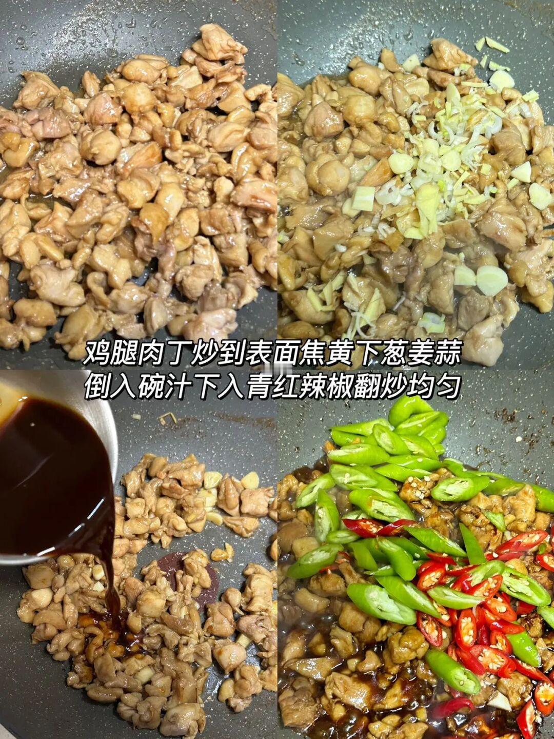 3️⃣鸡腿肉丁炒到表面焦黄,下葱姜蒜倒入料汁,下入青红辣椒翻炒均匀