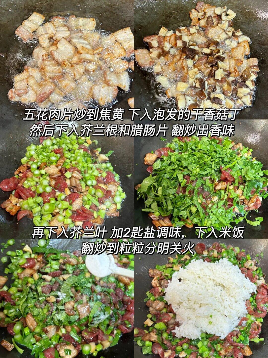 2️⃣五花肉片炒到焦黄下入香菇丁然后下入芥兰根和腊肠片翻炒出香味