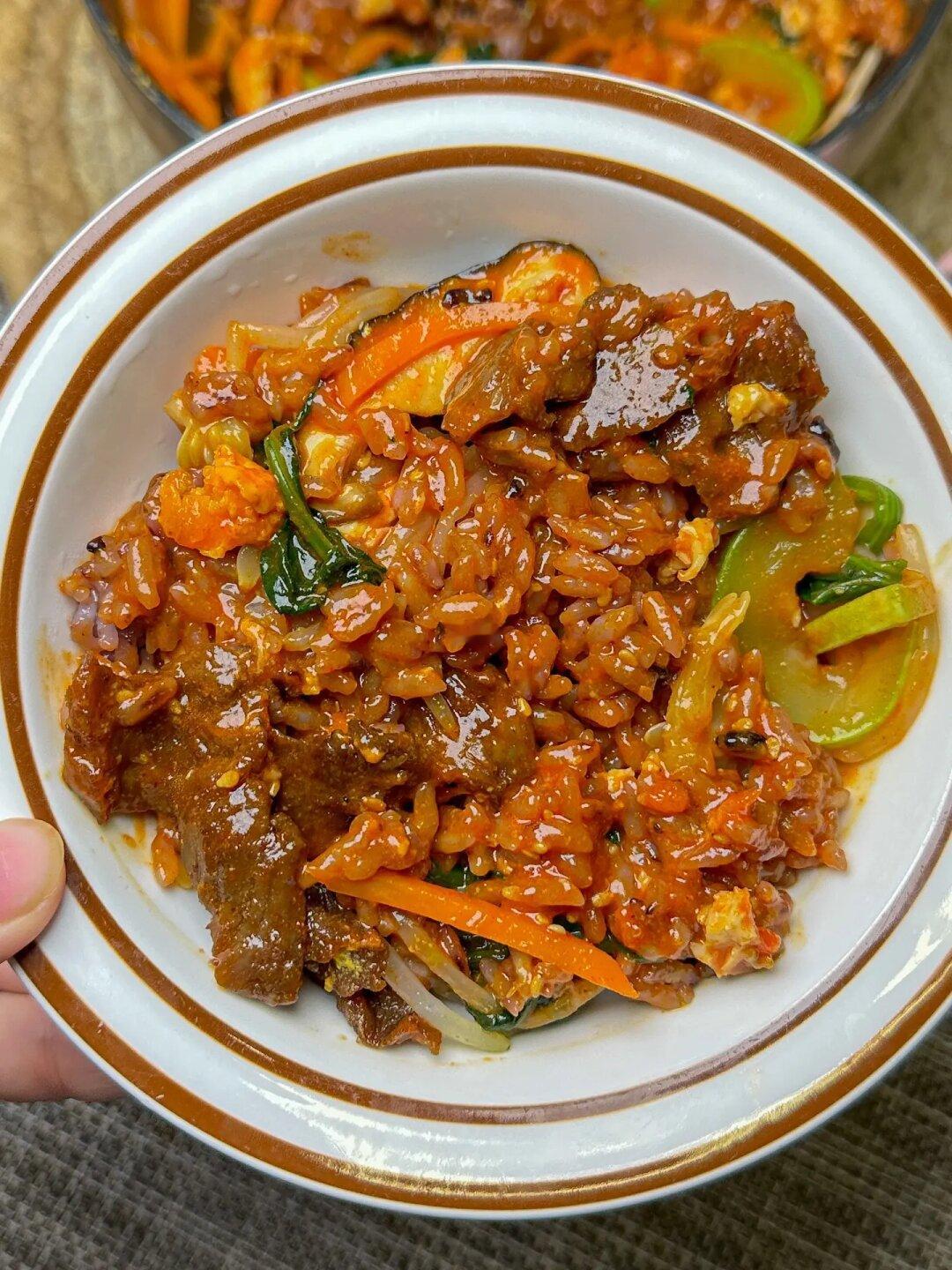 2️⃣蔬菜炒熟或者煮熟(炒的会更香 煮的热量低些)煎好鸡蛋备用,牛肉切片炒熟,食材都铺在米饭上淋上酱汁拌匀
