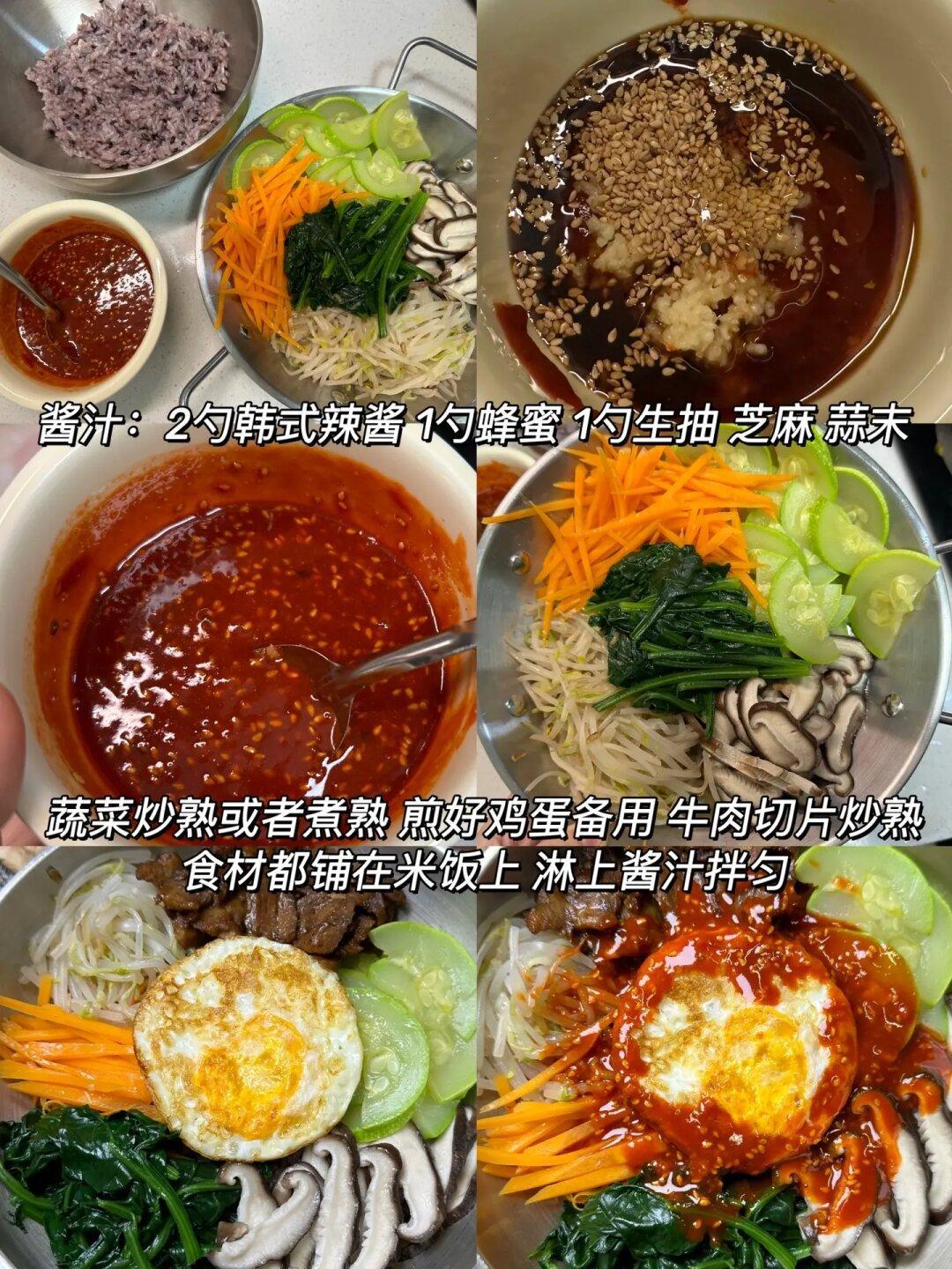 1️⃣拌饭酱汁:2勺韩式辣酱1勺蜂蜜1勺生抽 芝麻蒜末,搅拌均匀备用