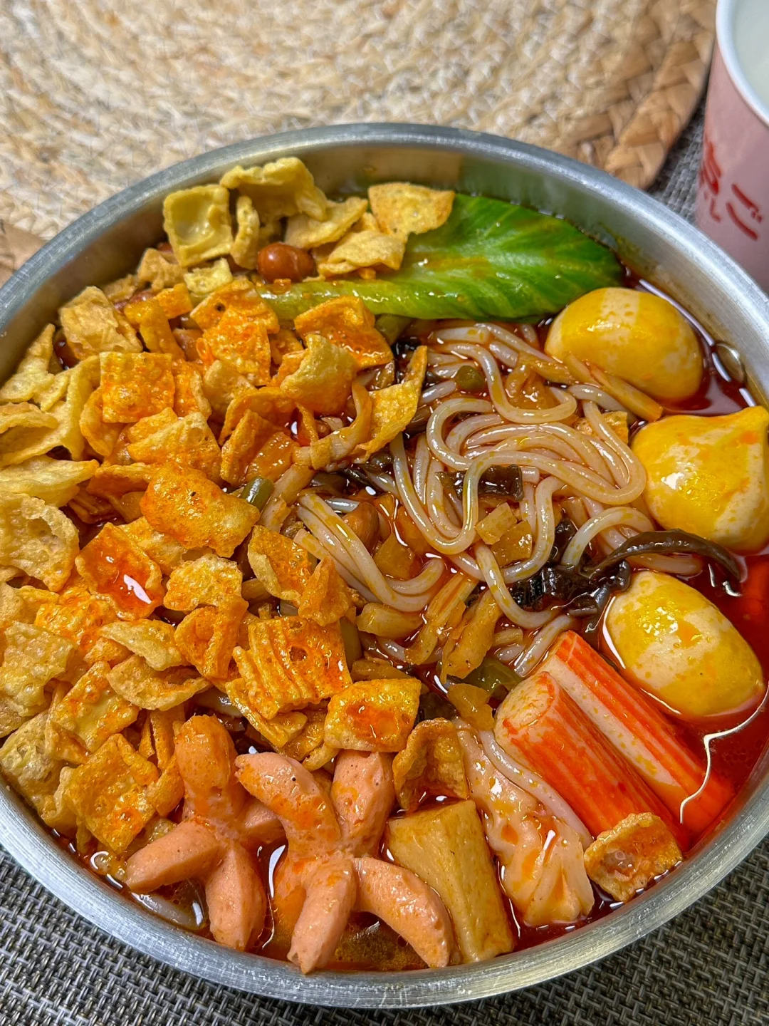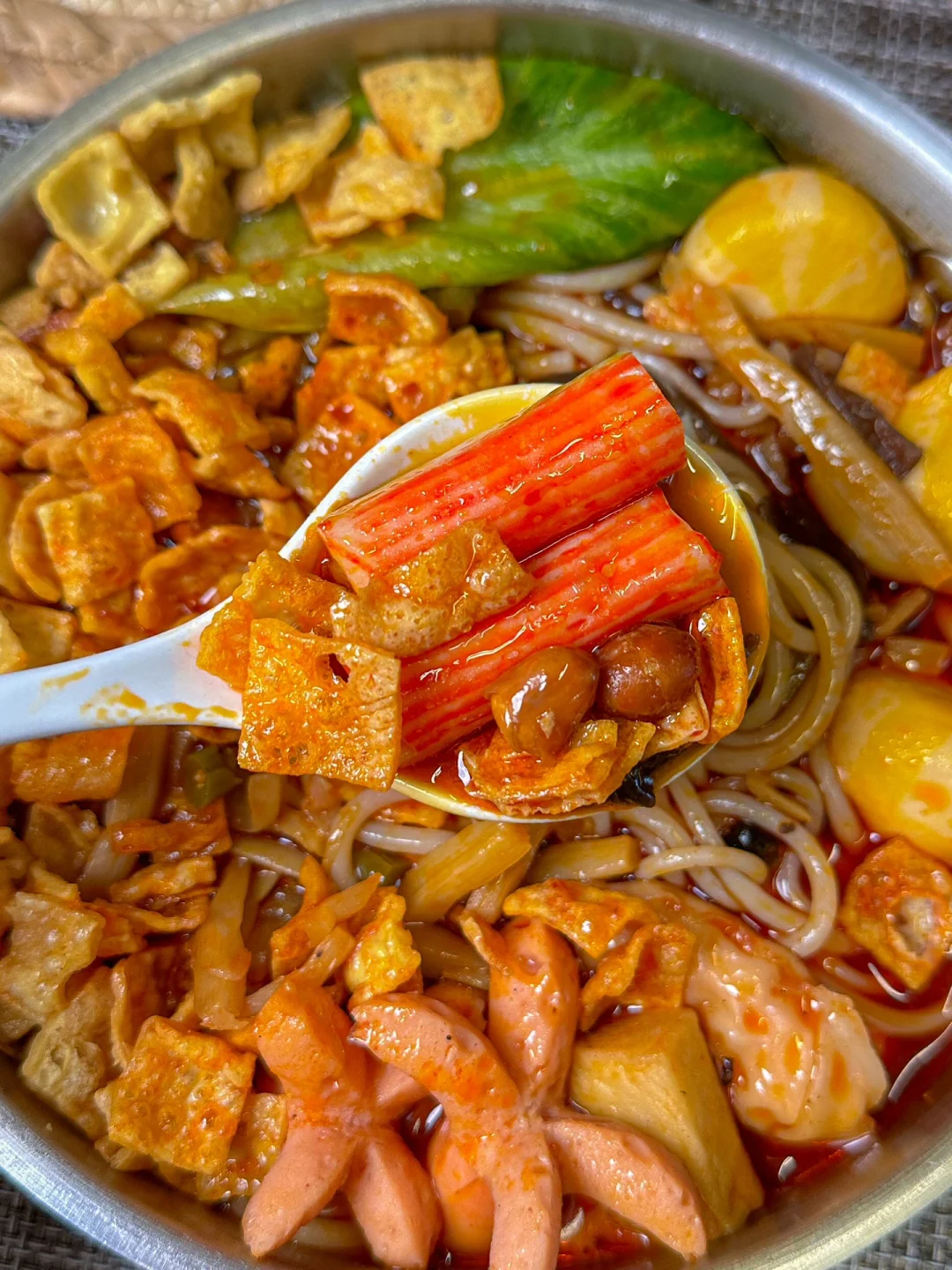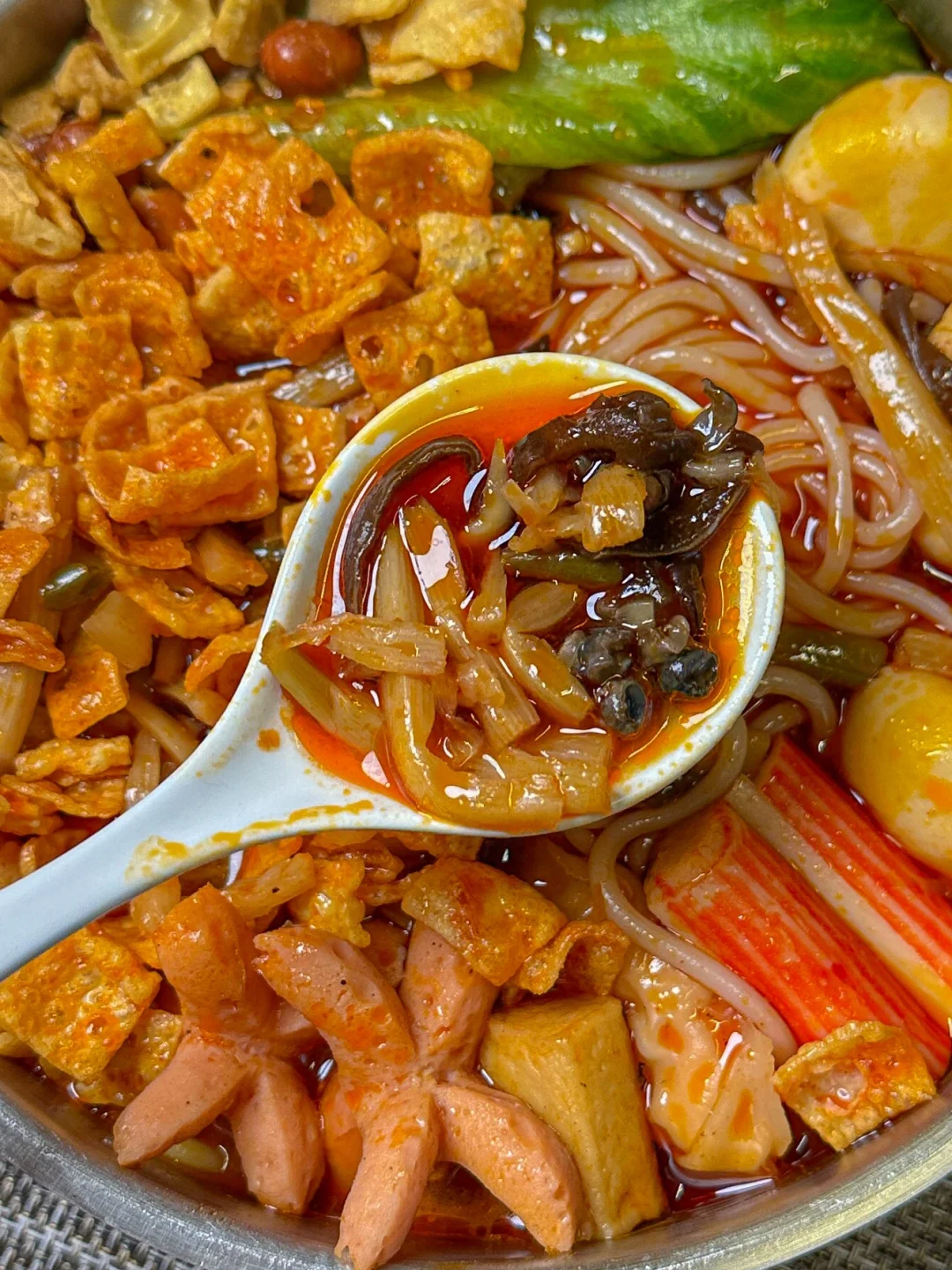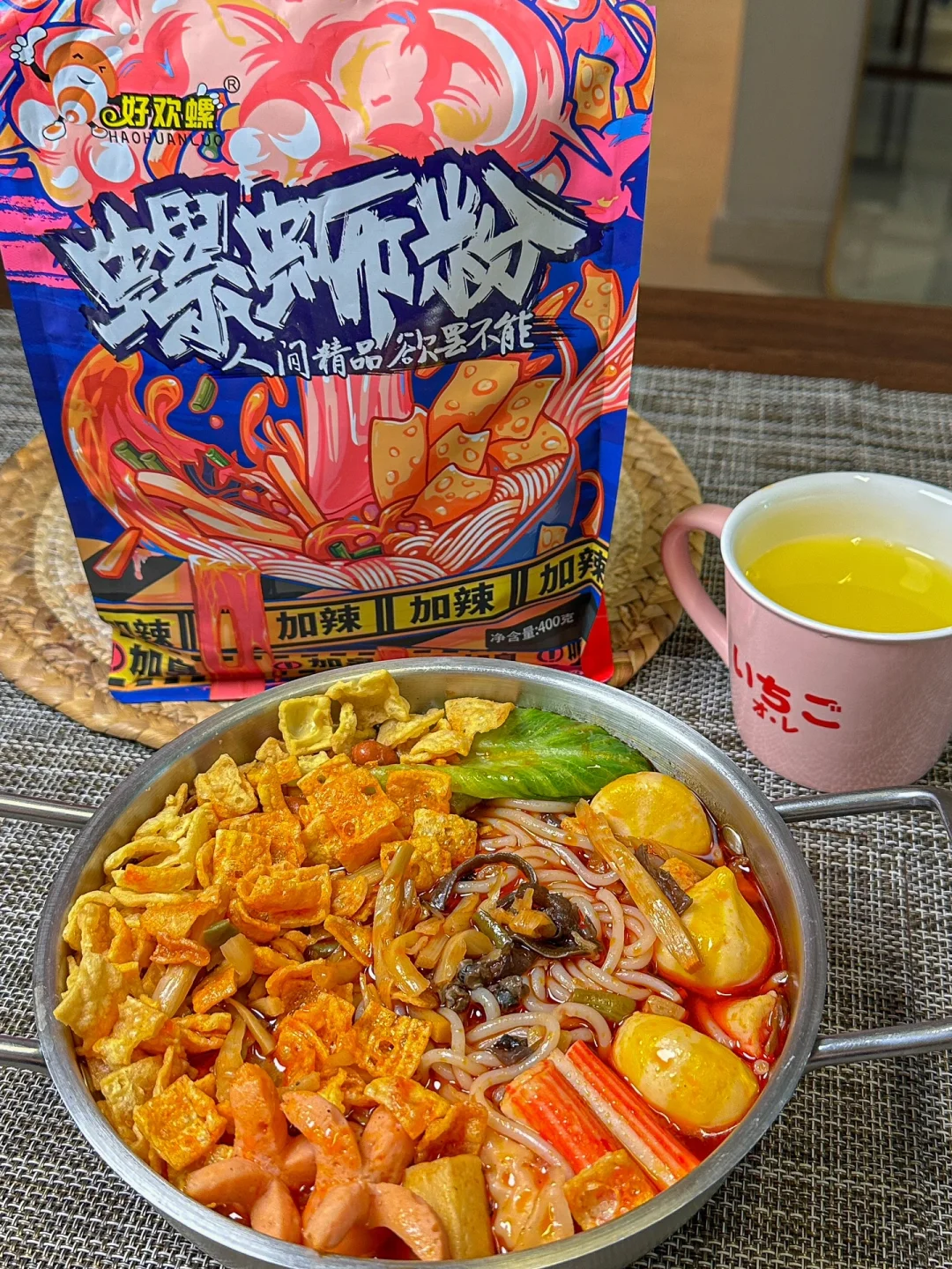 你就得到了一碗超豪华版螺蛳粉,好欢螺这个加辣加臭的吃起来太过瘾啦,而且是双倍的腐竹!!第一次吃就爱上了,而且我最喜欢的是它的汤底,是猪骨熬制的,喝起来特别鲜~加上丸子和青菜就好像在吃螺蛳粉锅底的火锅,妈妈都说太好吃了~