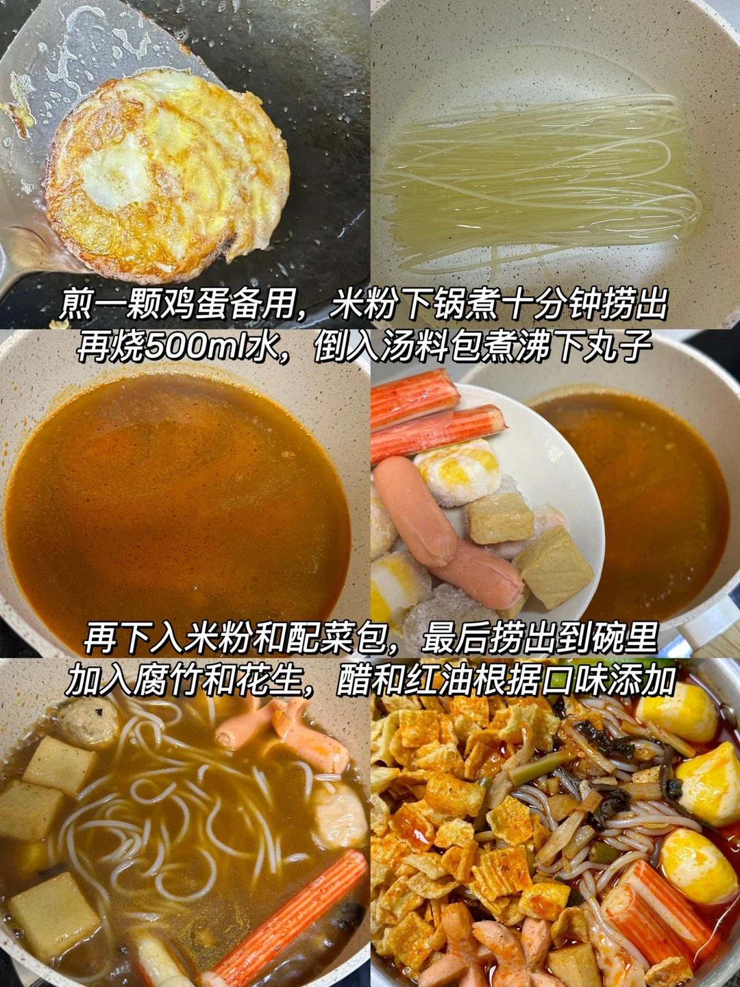 3️⃣再下入米粉和配菜包,最后捞出到碗里加入腐竹和花生,醋和红油根据口味添加