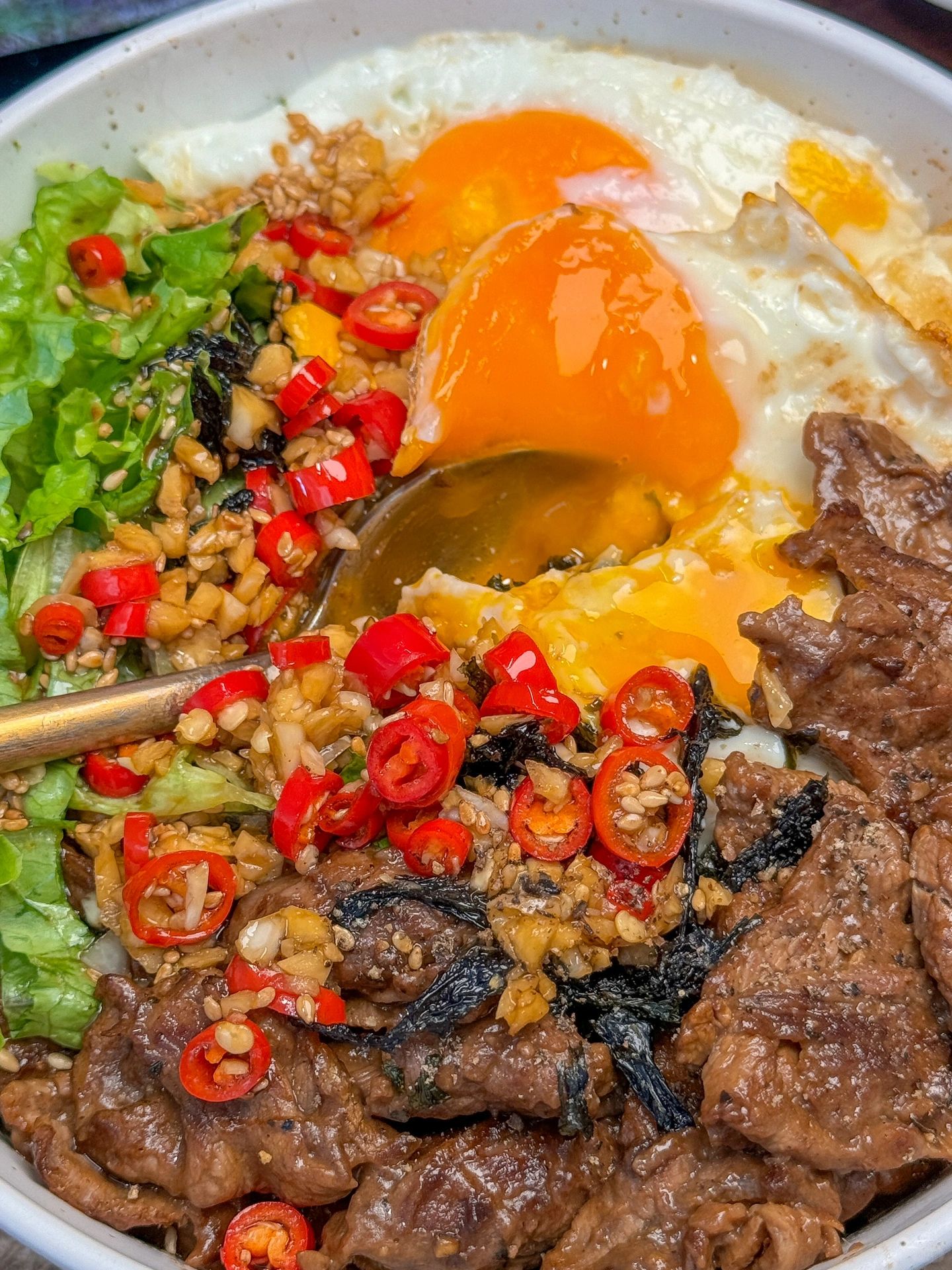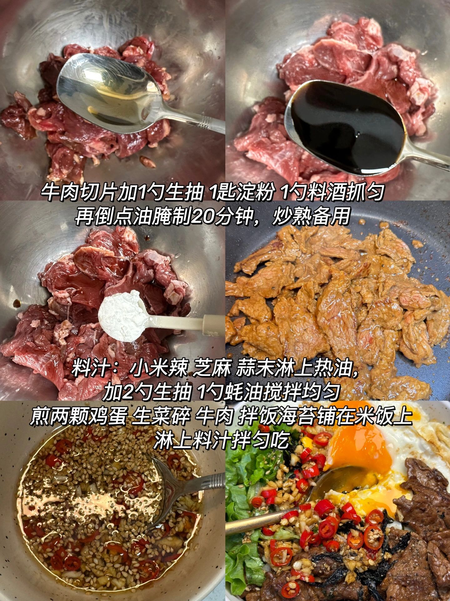 3️⃣煎两颗鸡蛋 生菜碎牛肉拌饭海苔铺在米饭上,淋上料汁拌匀吃