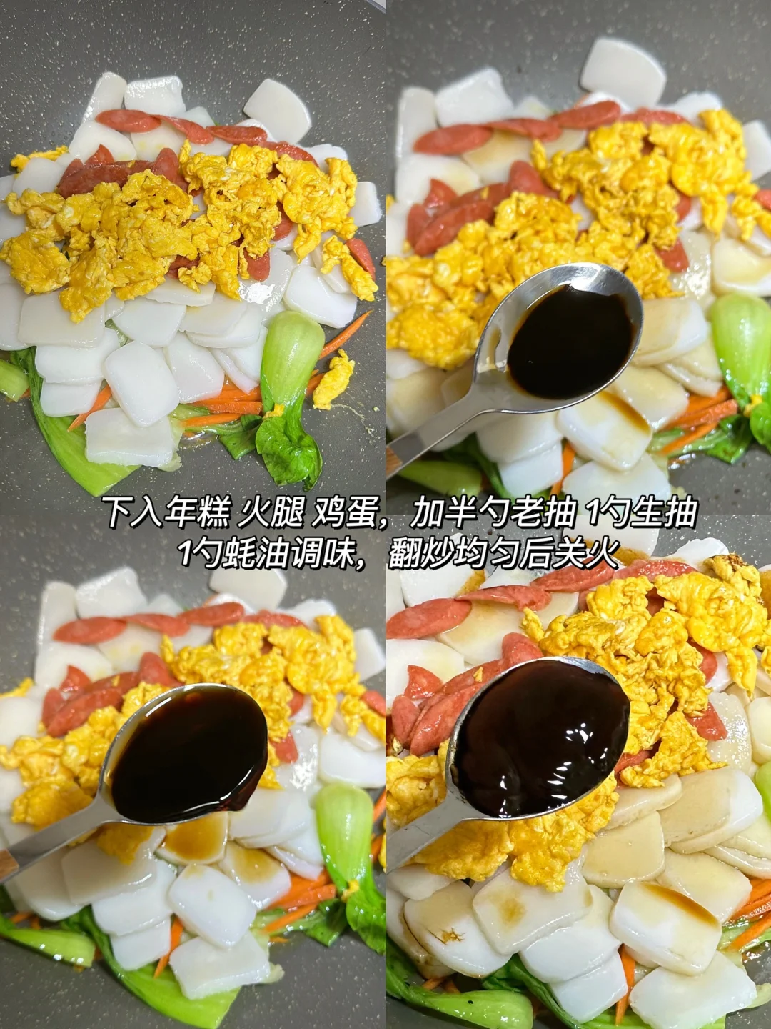 2️⃣下入年糕 火腿 鸡蛋,加半勺老抽 1勺生抽和1勺蚝油调味,翻炒均匀后关火