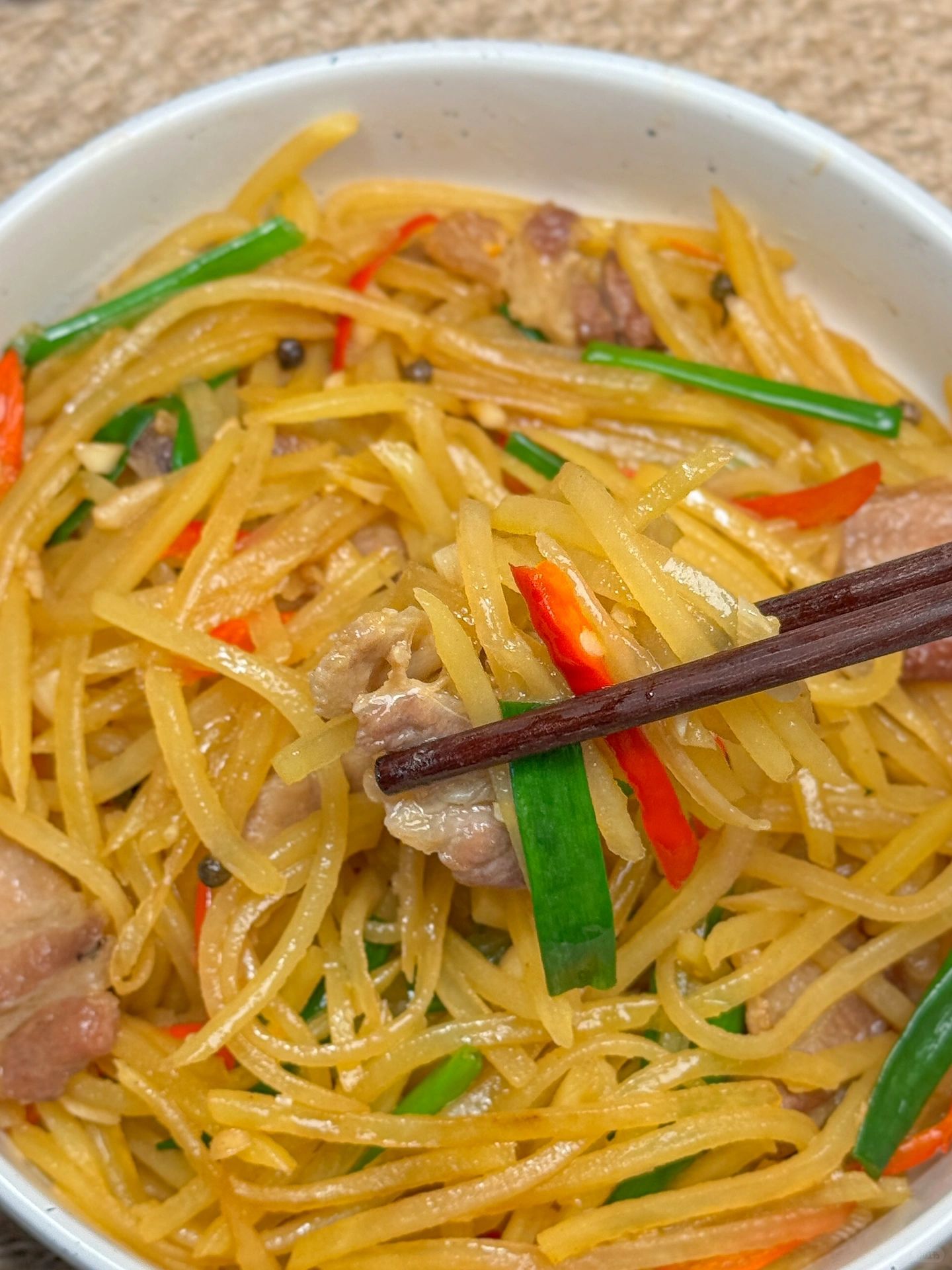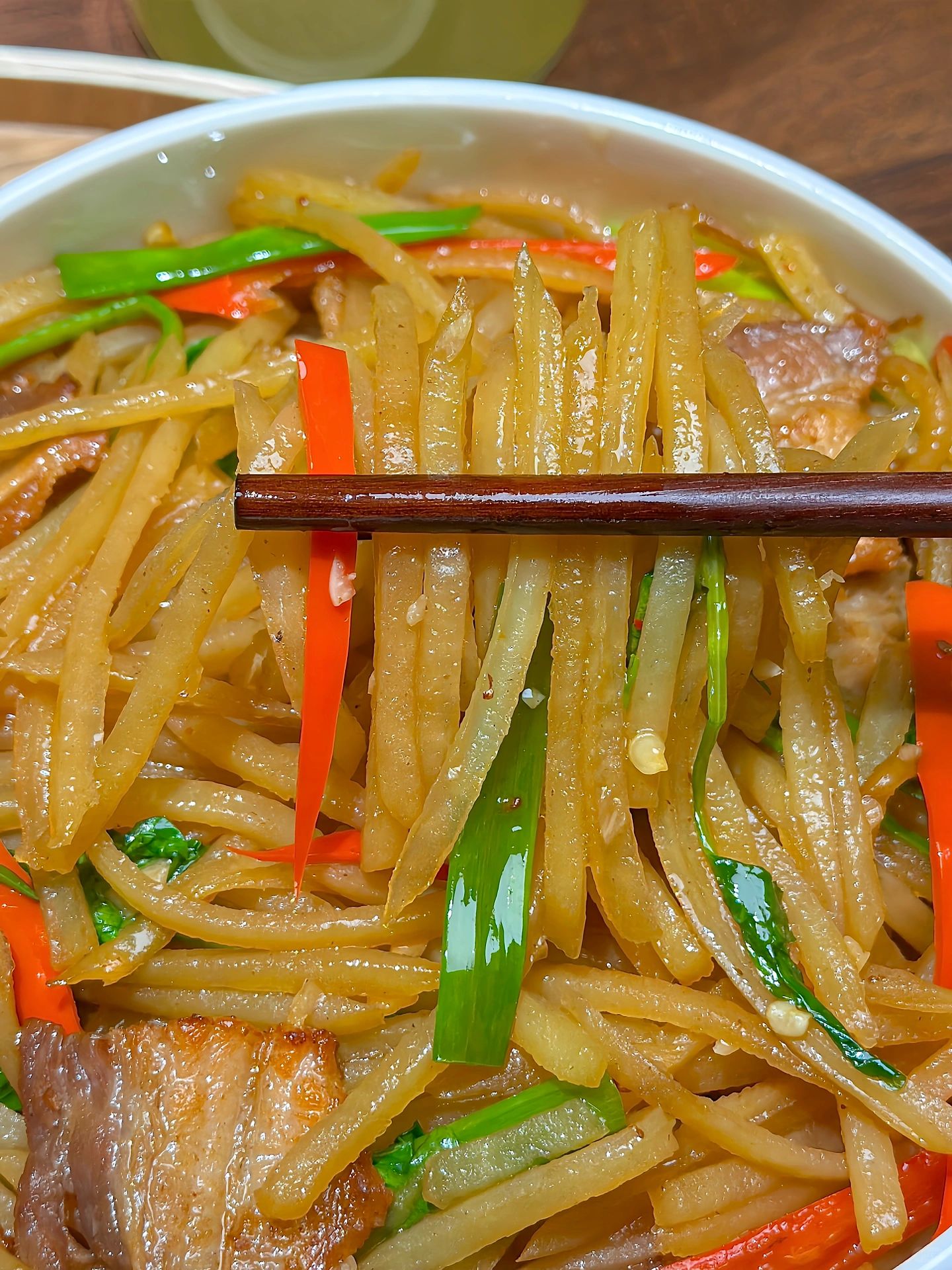 1️⃣五花肉片炒到焦黄下土豆丝 小米辣椒丝,2勺生抽 1勺蚝油 口重再加1匙盐,如果想吃酸甜口要再加些糖和醋哦