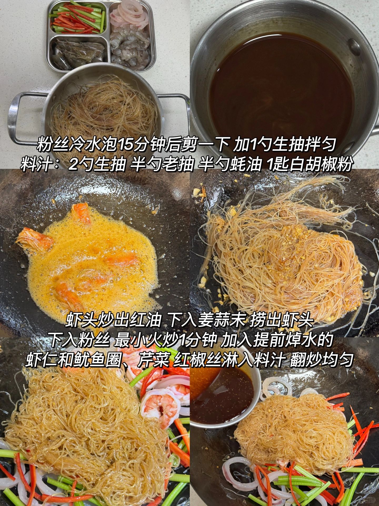 2️⃣虾头炒出红油,下入姜蒜末 捞出虾头下入粉丝最小火炒1分钟,加入提前焯水的虾仁和鱿鱼圈、芹菜 红椒丝淋入料汁翻炒均匀