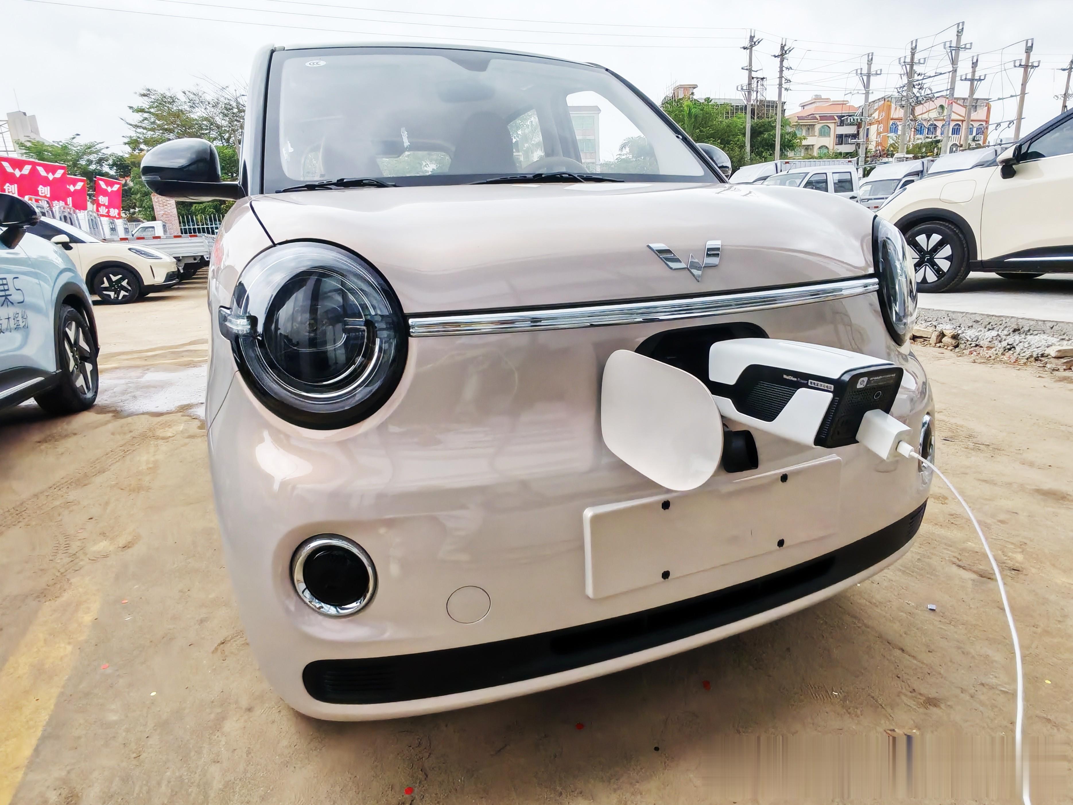 别急,除了交流口,第五代宏光MINIEV旁边还有个直流口,也就是俗称的快充口。经实际测试,第五代宏光MINIEV可以使用唯电宝2mini这类直流口放电枪实现对外放电功能,其原理是先将车辆直流电取出,再在机身内部逆变成220V 50Hz的标准家用交流电,从而安全地带动各类电器。