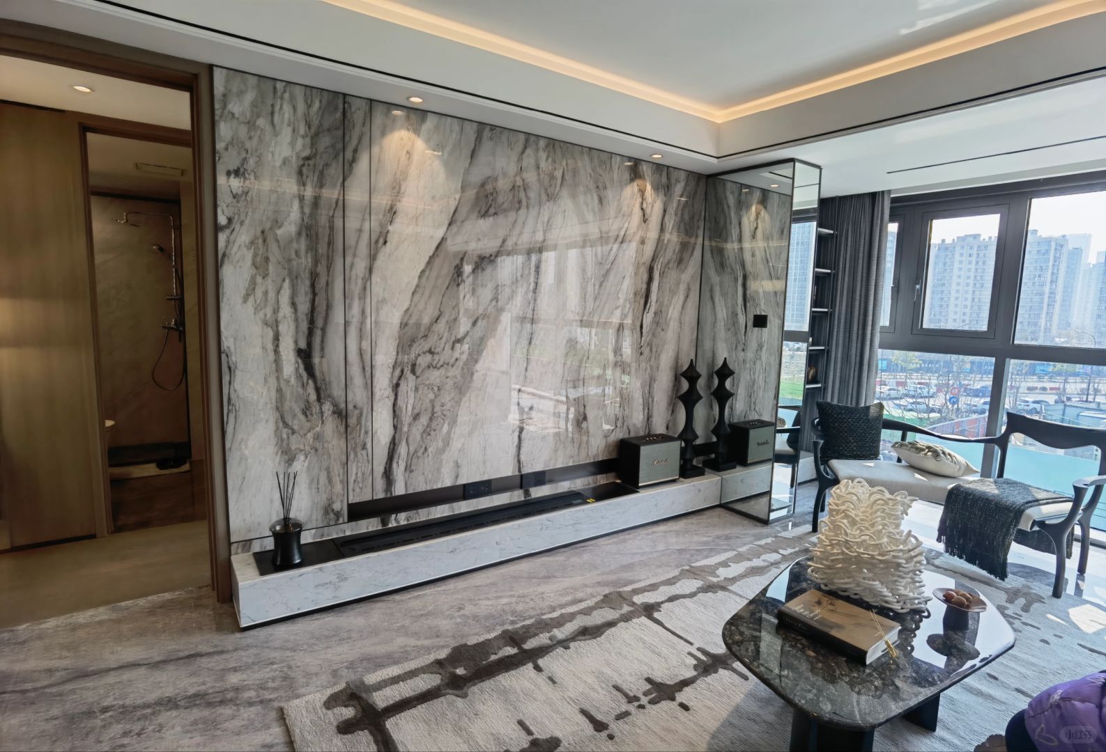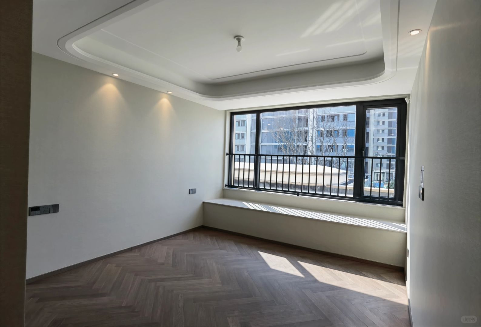 绿城完胜,圆弧吊顶+主卧地面人字拼接,还是那么的讲究。而且很多细节都很科技化、人性化,比如说镜柜、鞋柜里的一些细节。