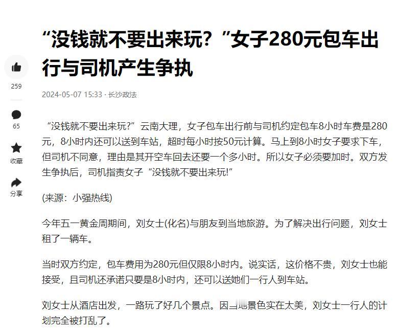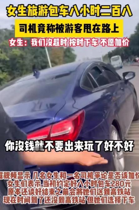 “没钱就不要出来玩?”云南大理,女子包了车出门。她和司机说好了,八个小时包车费是280块,而且八小时内还可以送她到车站。超时的话,每小时要加50块钱。可就在八小时快到的时候,女子说要下车了。可司机不同意,因为他得空车开回去还得花一个多小时。所以女子必须得加时。两个人吵了起来,司机就冲着女子嚷嚷:“没钱就不要出来玩?”