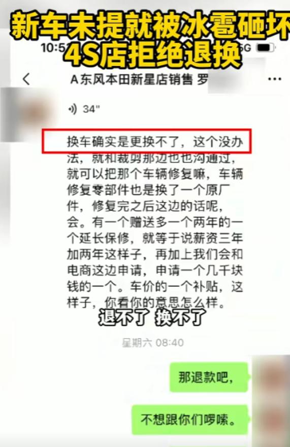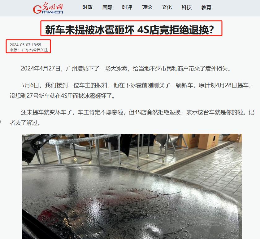 “把消费者当傻子?”广东广州,一男子去4S店提车时。发现车子因下冰雹被砸坏,男子要求退换车,但4S店却以贷款和保险已经批了等于已经交付为由,拒绝男子的诉求。但男子认为,只要还没提车,就不算交付!