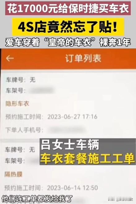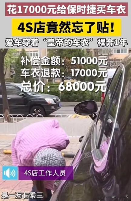 北京,女子花 17000 元买车衣,4S 店竟然忘了贴!直到快一年后去修理厂修车,才知道车子一直在“裸奔”!女子:“我一直以为车子有车衣,所以平时剐蹭都没在意!4S 店这是赤裸裸的欺骗,我要求退车!”网友:这要是没发现,4S 店岂不是血赚?