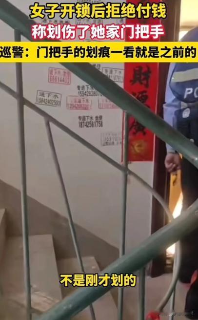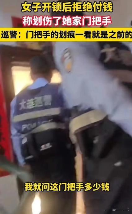 白嫖不成就想讹钱?民警都无语了!大连一女子花100元请开锁师傅上门服务,谁料,被师傅几分钟就搞定了!她觉得自己吃亏,不光拒绝付钱,还污蔑师傅划伤了自己的门把手!