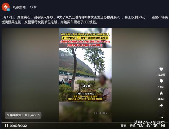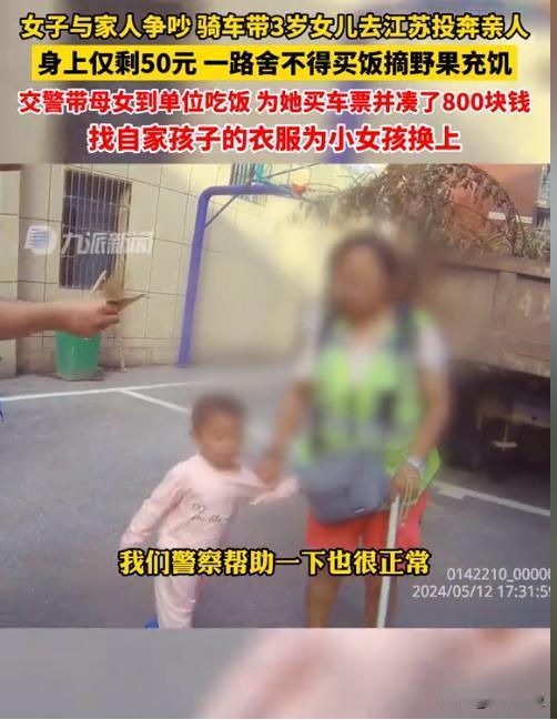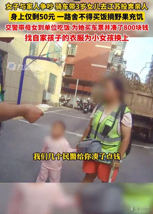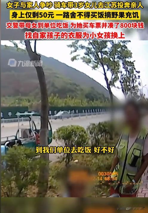 一女子与家人争吵,骑电三轮带3岁女儿从江西九江骑行去江苏投奔亲人,身上仅剩50元,一路舍不得买饭摘野果充饥,因三轮车出现故障求助交警,得知始末的交警带母女到单位吃饭,为她买车票并凑了800块钱。