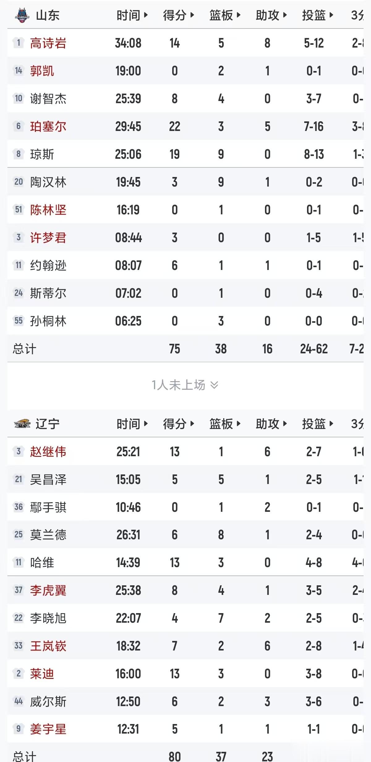 易边再战,哈维开局连中三记三分,但辽宁连续失误被山东不断打反击,本节进行四分钟辽宁队先叫停调整,随后辽宁队还是没解决失误问题,山东一度追到还差1分,莱迪连续打成2+1稳住领先,三节战罢辽宁领先4分。末节决战,开局王岚嵚连续得分打停山东,随后双方进攻效率都明显下降,最终辽宁80-75击败山东。