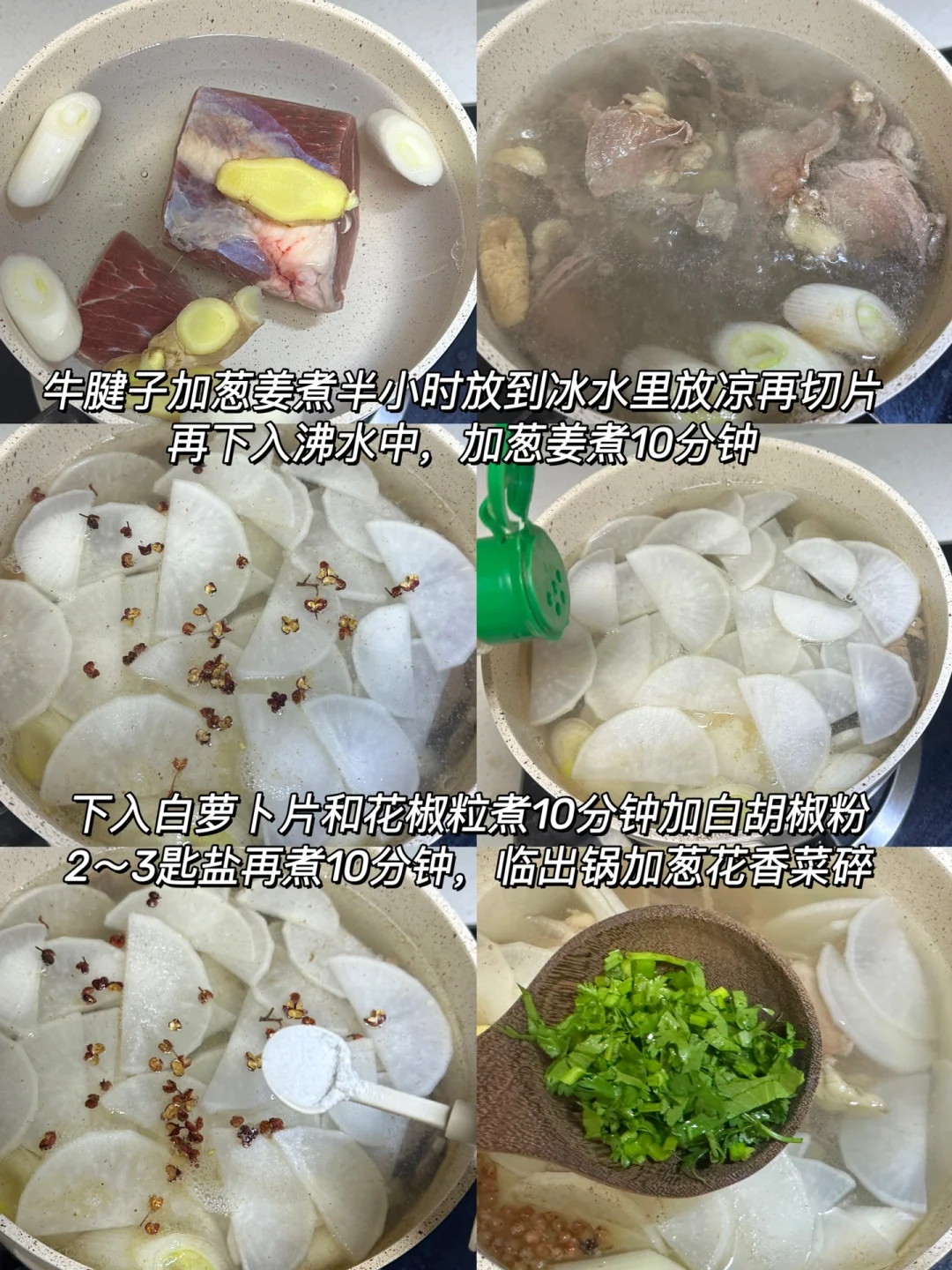2️⃣下入白萝卜片和花椒粒煮10分钟加白胡椒粉2~3匙盐再煮10分钟,临出锅加葱花香菜碎