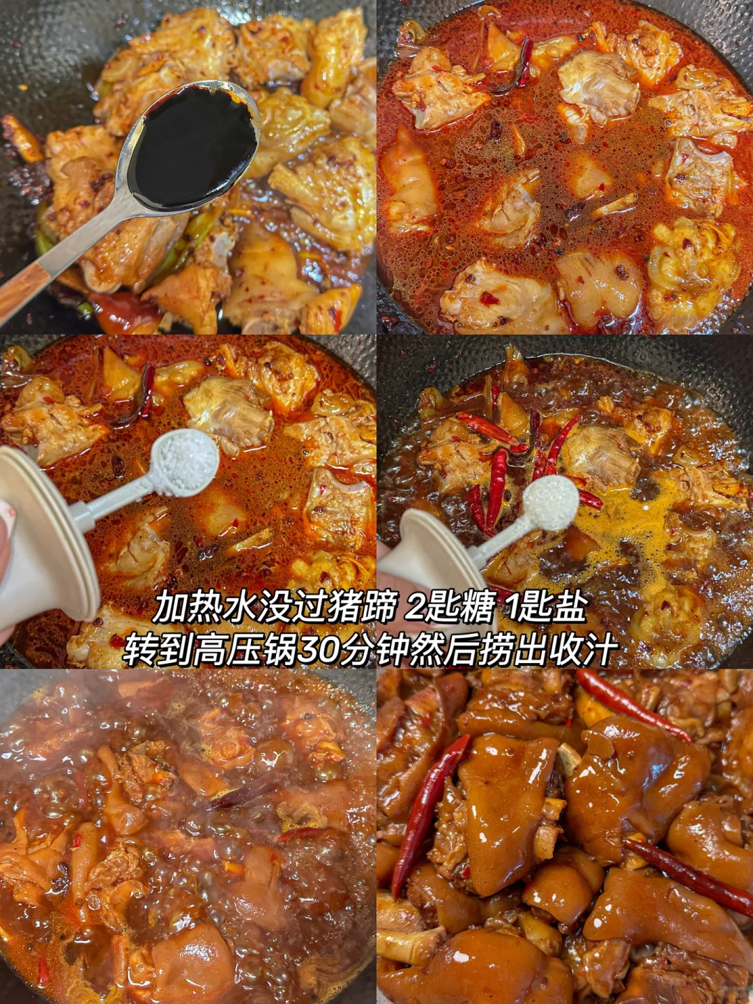 3️⃣ 加热水没过猪蹄2匙糖 1匙盐,转到高压锅30分钟然后捞出收汁