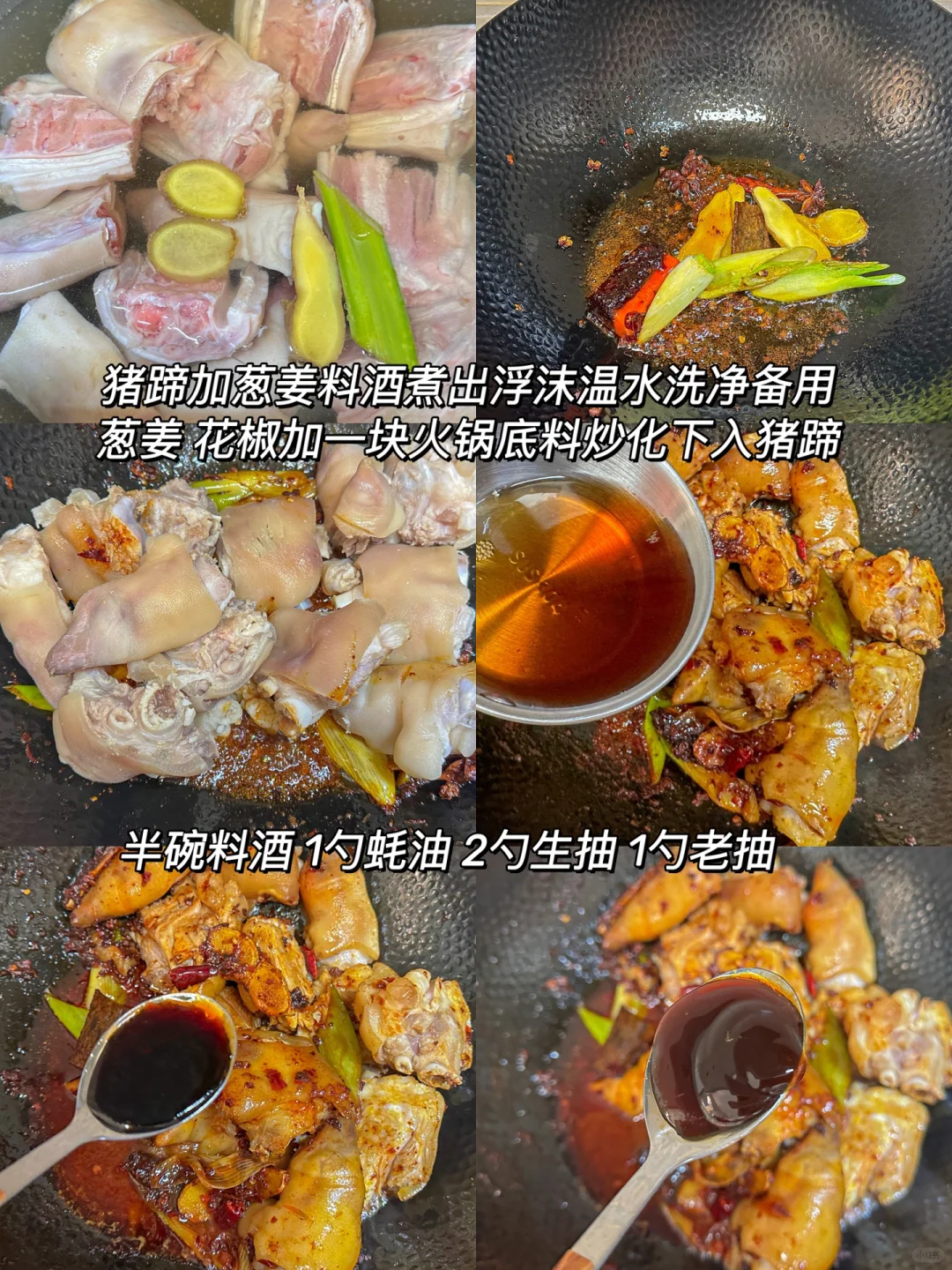 2️⃣葱姜 花椒加一块火锅底料炒化下入猪蹄,加半碗料酒1勺蚝油2勺生抽 1勺老抽