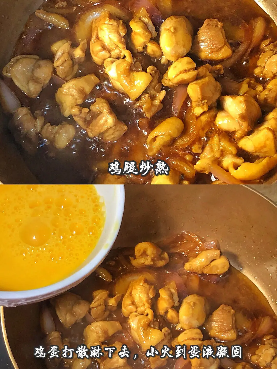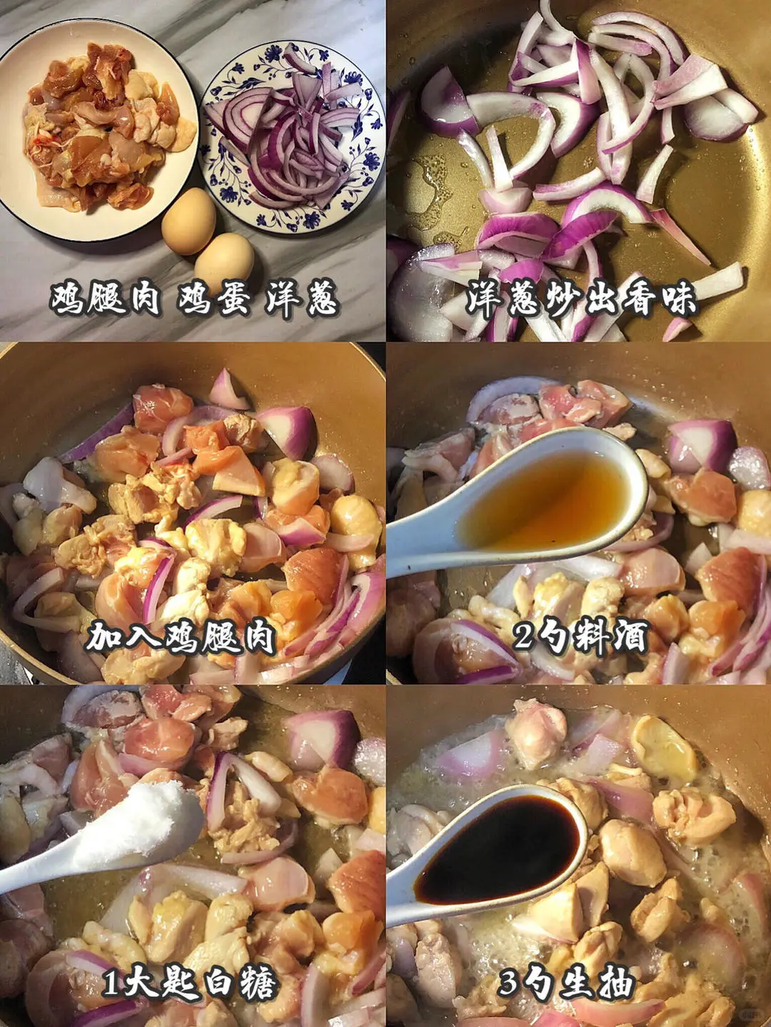 1️⃣鸡腿剔骨,把肉切成小块,洋葱切丝,鸡蛋打散备用