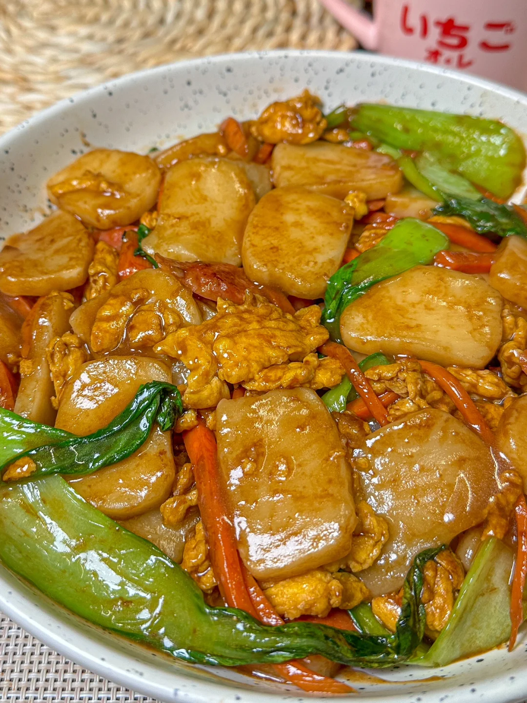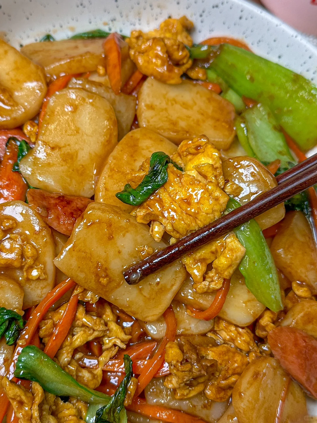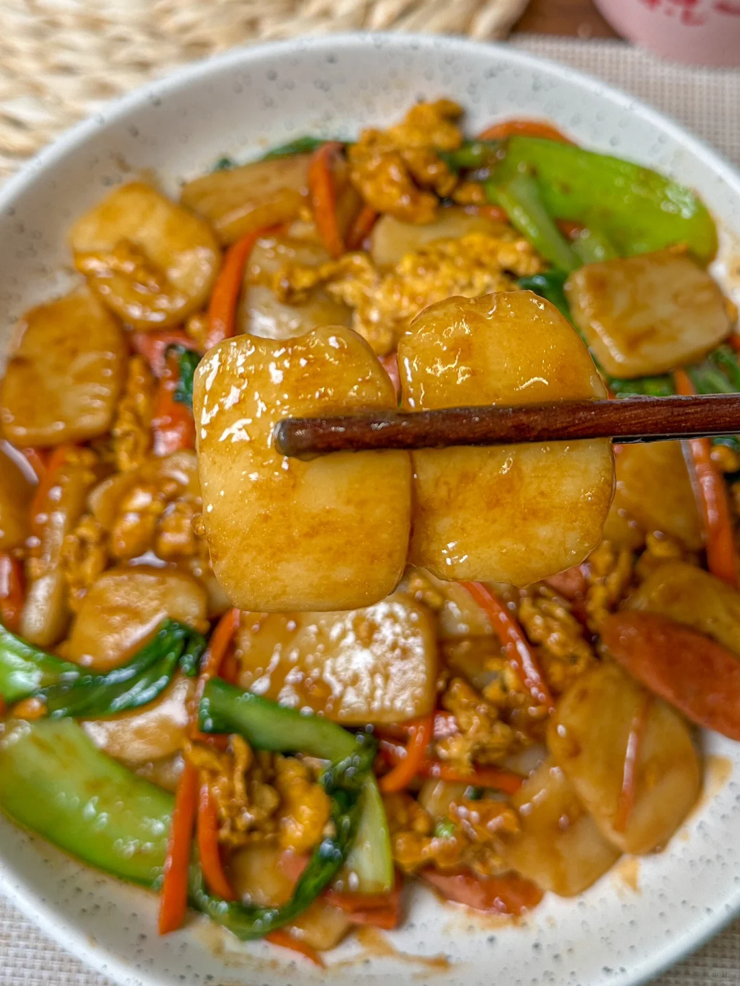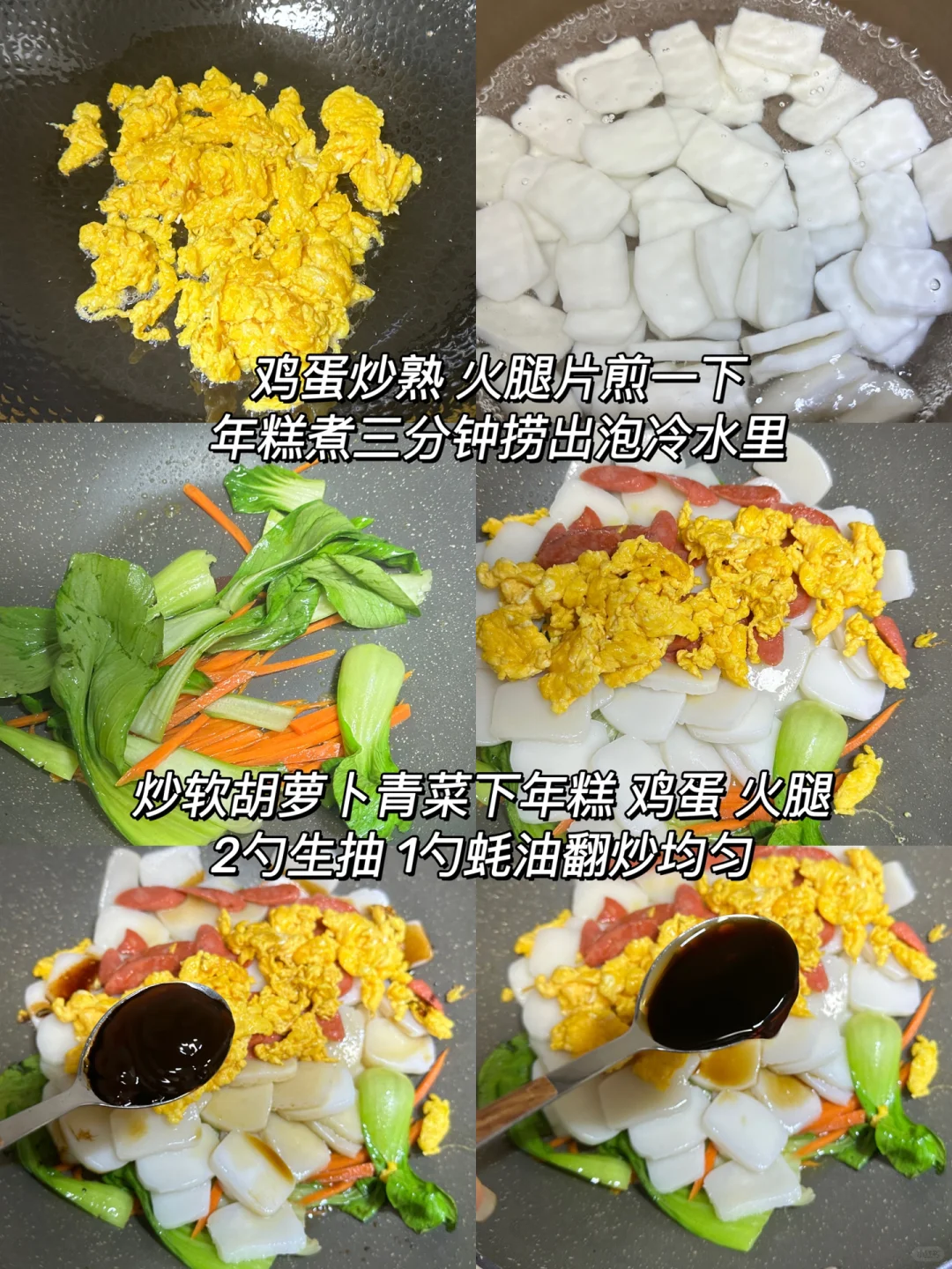 2️⃣炒软胡萝下入青菜 年糕 鸡蛋 火腿,加2勺生抽 1勺蚝油翻炒均匀