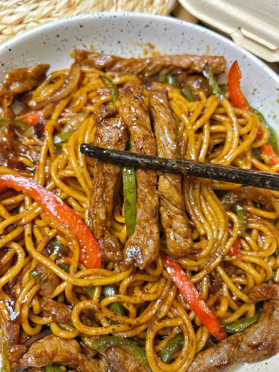 3️⃣锅里热油炒软洋葱丝 青红辣椒丝再加入牛柳和意面淋入料汁翻炒均匀就好啦~