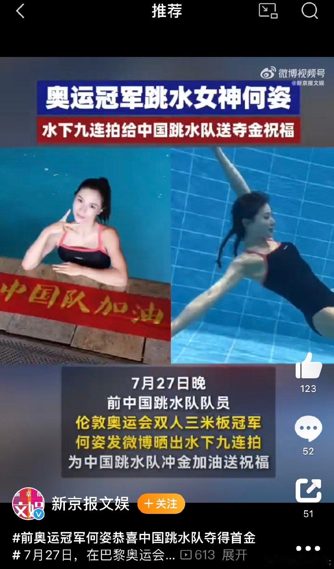 #前奥运冠军何姿恭喜中国跳水队夺得首金#真的非常令人佩服,尤其是看到前奥运冠军都在为他们祝贺的时候也是蛮感动的,这也许就是奥运精神的一代代传承。#奥运冠军何姿水下应援中国跳水队#