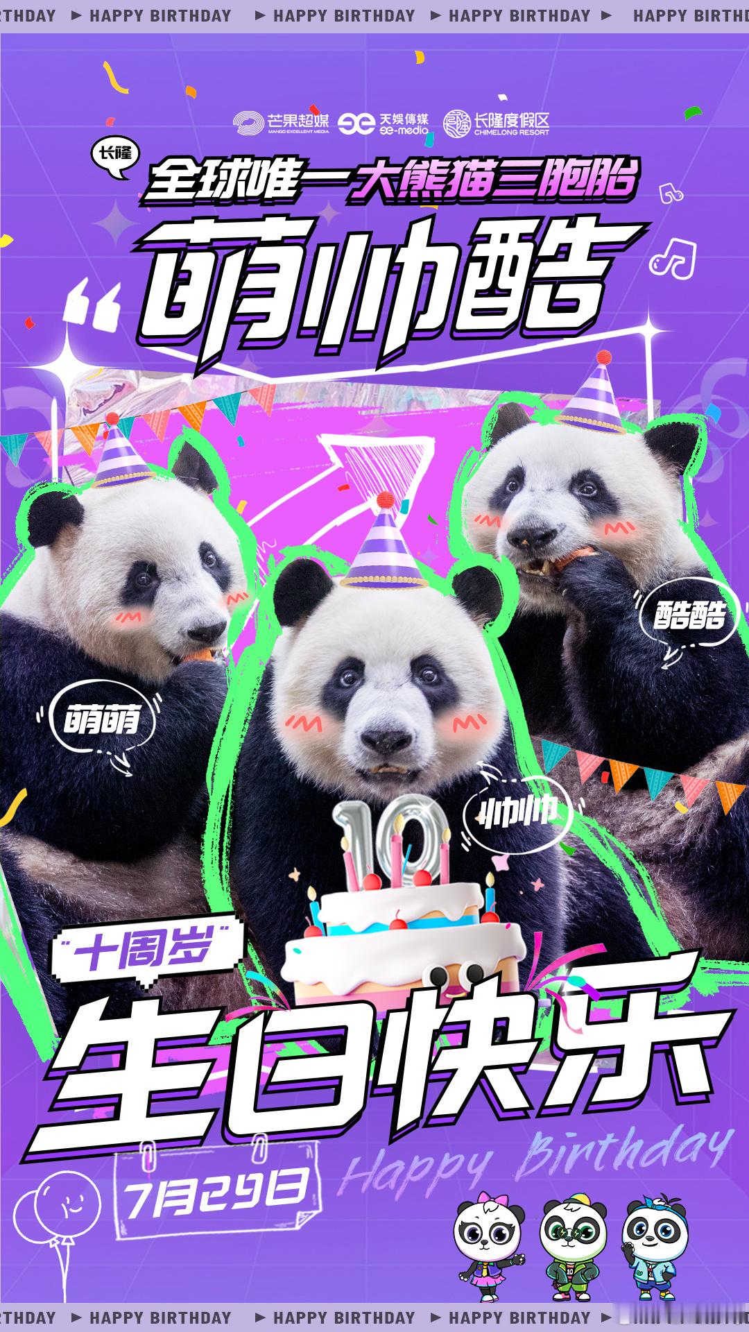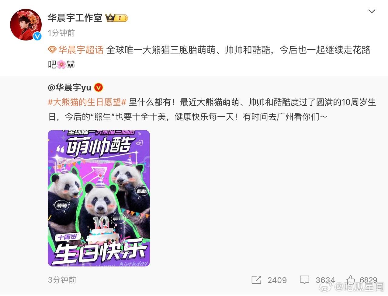 #华晨宇给大熊猫三胞胎庆生# 华晨宇发博为大熊猫三胞胎的十岁生日增添欢乐!他的祝