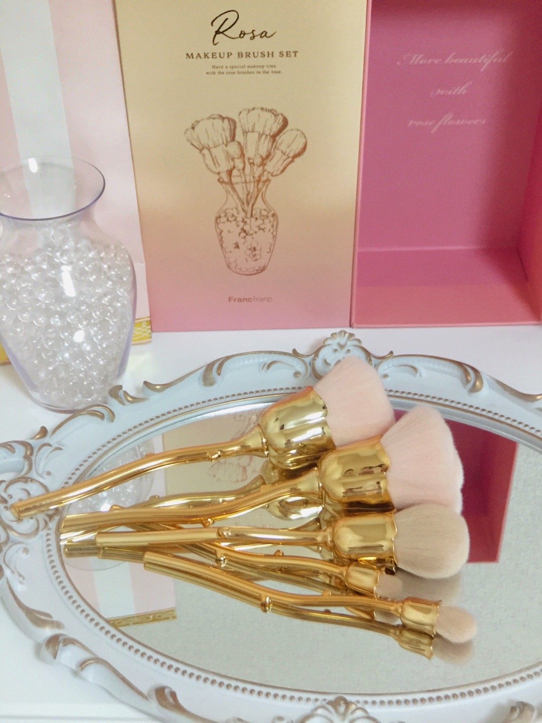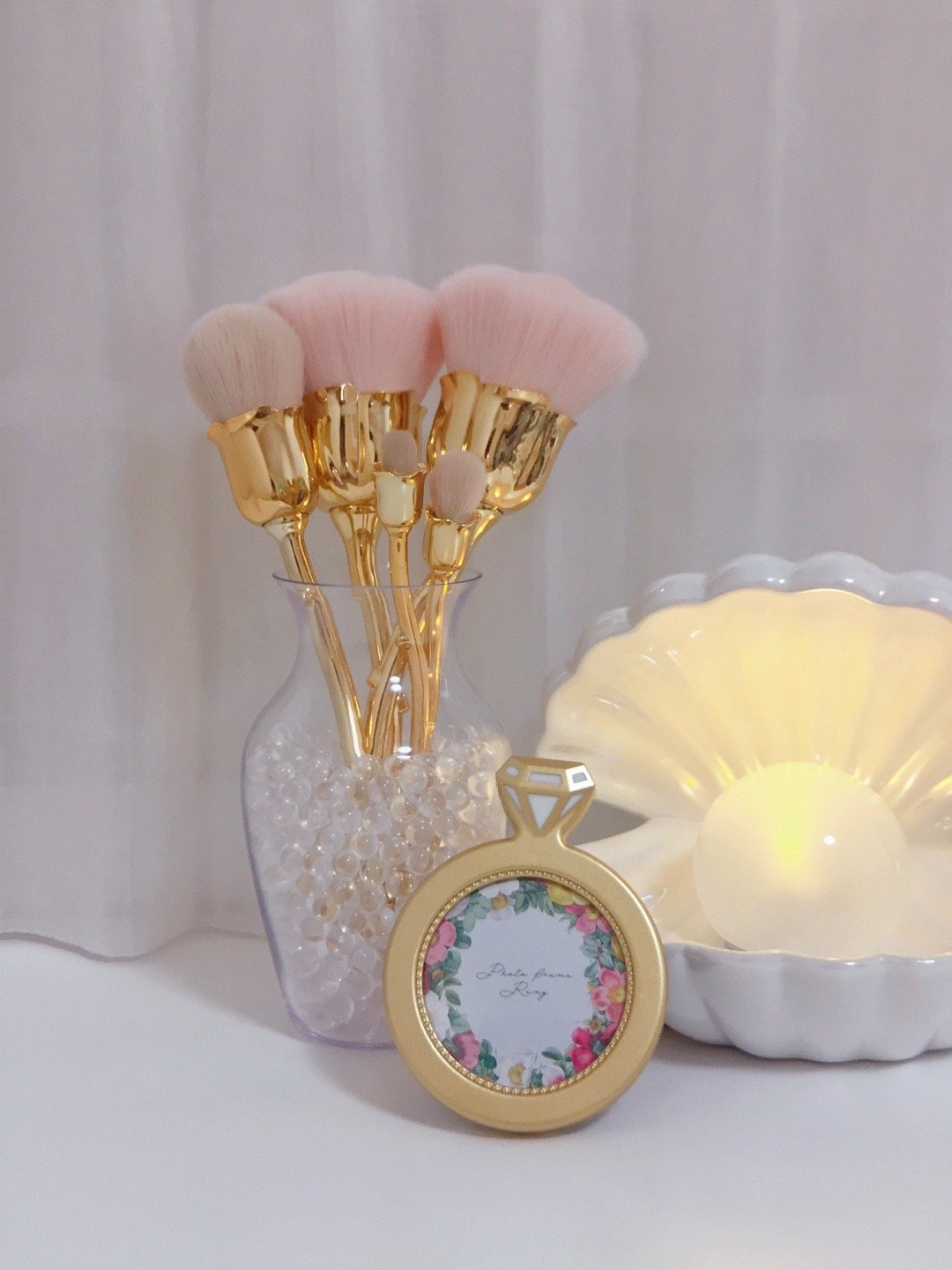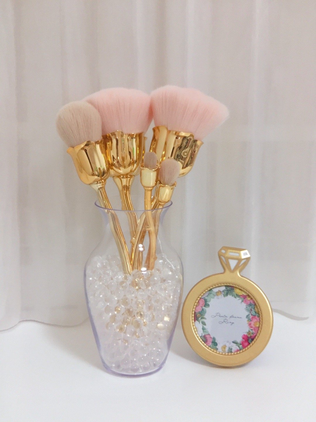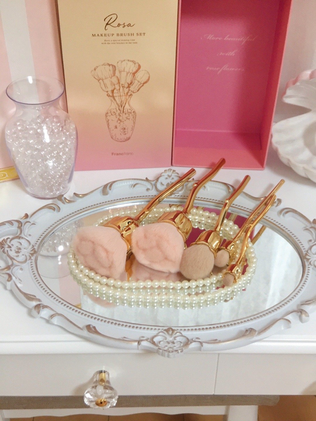 ▫️透明的花瓶刷架里装着晶莹剔透的小珠子,将玫瑰花型的化妆套刷插入瓶中。装点梳妆台简直不要太养眼🪞