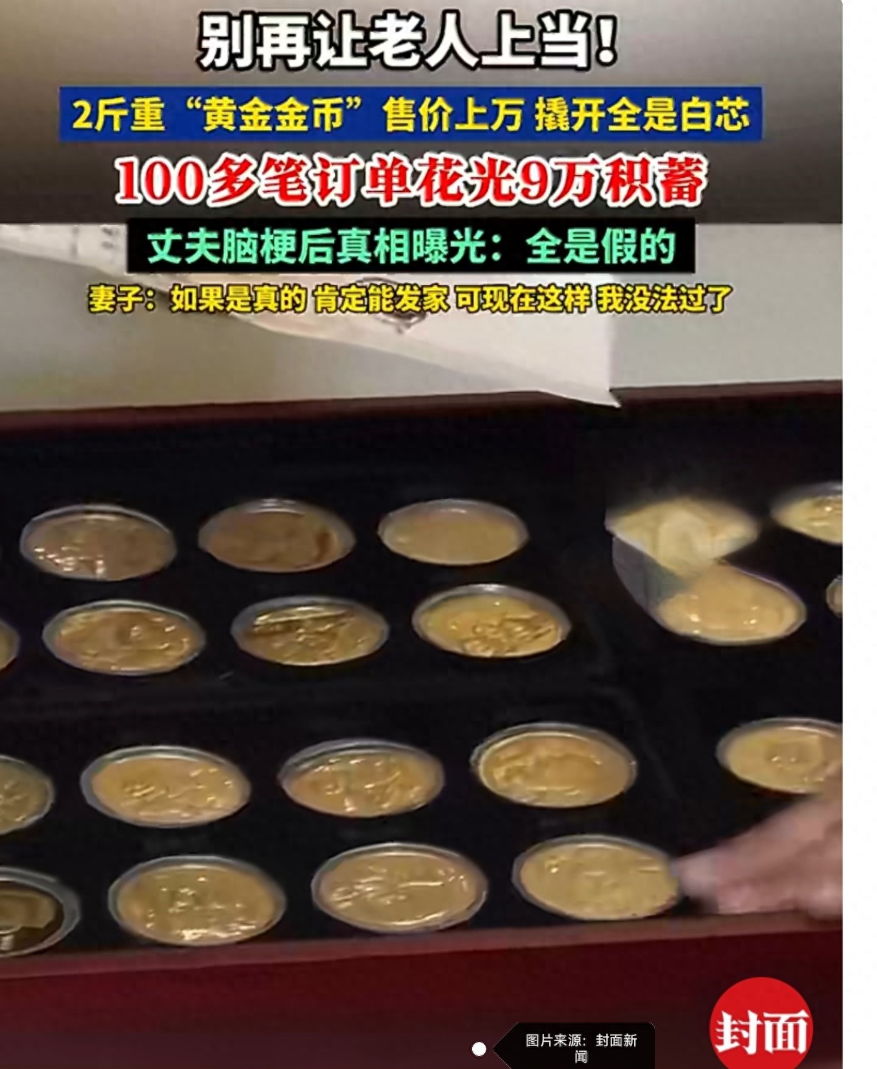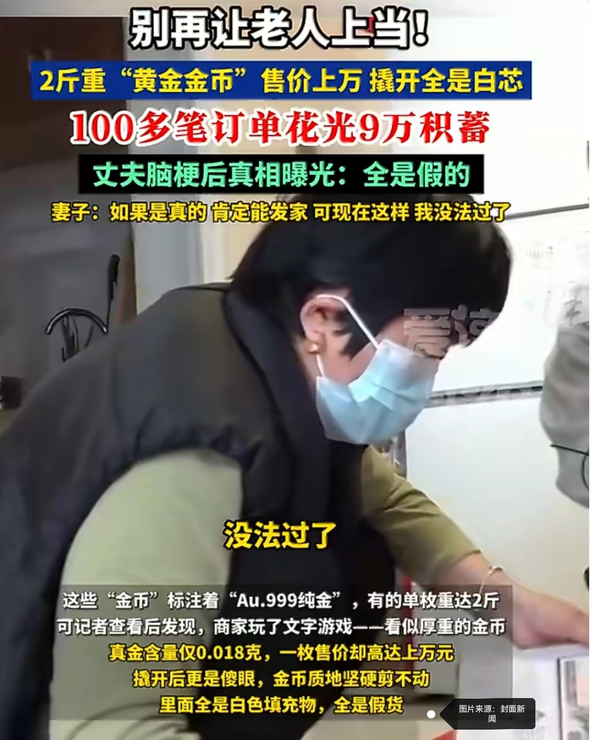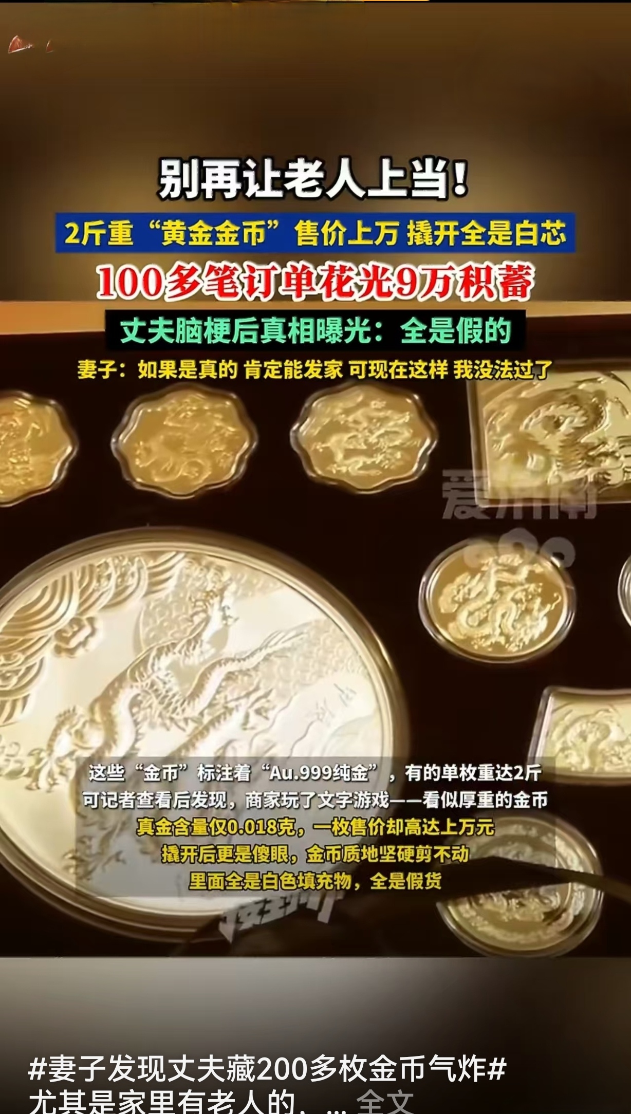 近日,河南发生了一件让人气愤又心酸的事。一位李大叔突发脑出血,妻子在病床前悉心照顾时,意外在自家床底下,发现了丈夫偷偷藏起来的200多枚“金币”。原本以为是家里的积蓄,能缓解家庭压力,可仔细一看,妻子彻底心凉。这些“金币”上醒目标注着“Au.999”,看似是足金藏品,旁边却用极小的字体印着“18mg”的字样,单枚含金量仅仅只有0.018克。