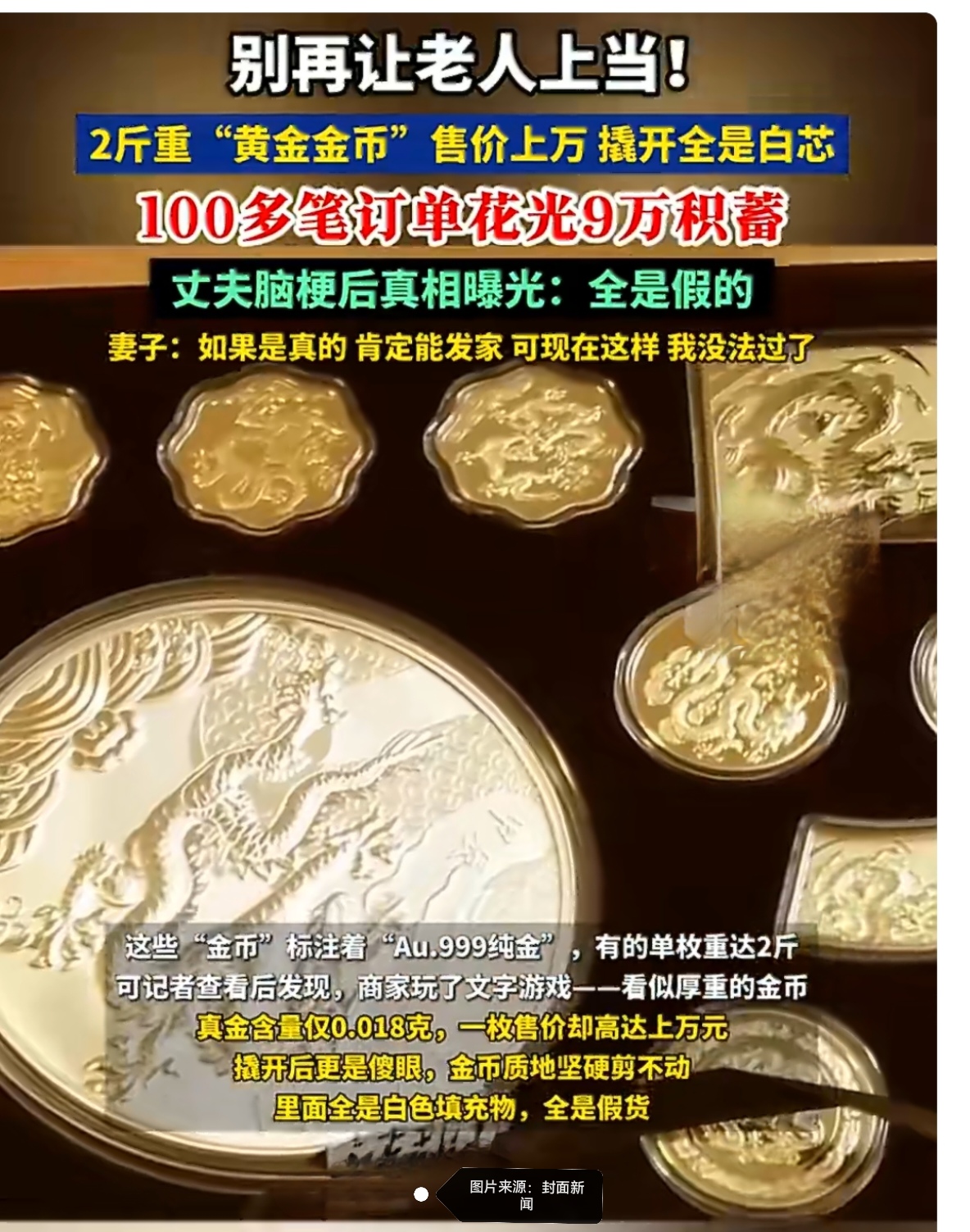 这些商家简直是把坑蒙拐骗玩到了极致,靠着文字游戏肆无忌惮地收割老年人。他们把“Au.999”放大印刷,刻意突出足金概念,再用“限量收藏、升值翻倍、高价回购”这些话术洗脑,却把真实的18毫克含金量藏在不起眼的角落,让不懂分辨的老人误以为买到了保值的黄金藏品,花上万块买一堆成本几十块的破铜烂铁。