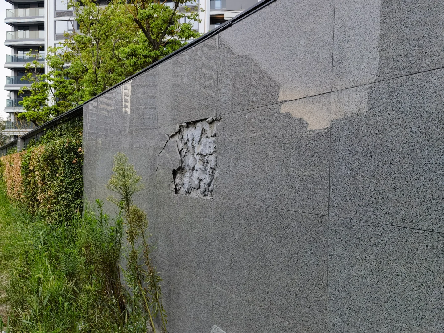 回答你几个问题。1:北立面是颜色问题业主要求开发商产出重做并且加了线条,业主投票达到90%之后整改的,9月底完工你可以再来看一下;2:围墙翠揽云镜是全石材,金澜府不是全石材,大部分都是真石漆涂料,立桩部分是石材,破损交付前会更改,刚好破的这个位置以后是绿道园林,会和南面直通钱二。