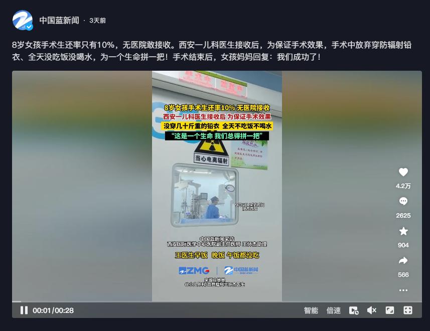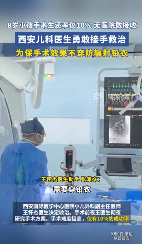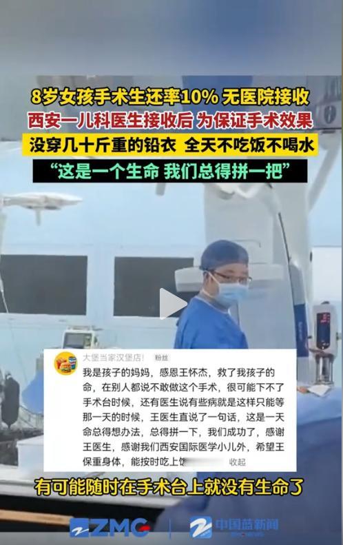 本文信源来自官方媒体【中国蓝新闻 —8岁女孩手术生还率只有10%,无医院敢接收。西安一儿科医生接收后,为保证手术效果,手术中放弃穿防辐射铅衣、全天没吃饭没喝水,为一个生命拼一把!手术结束后,女孩妈妈回复:我们成功了!】