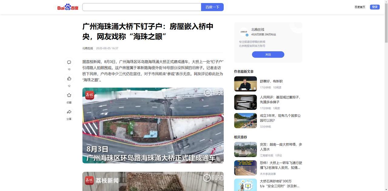 本文信源来自官方媒体【 北晚在线—广州海珠涌大桥下钉子户:房屋嵌入桥中央,网友戏称“海珠之眼”】