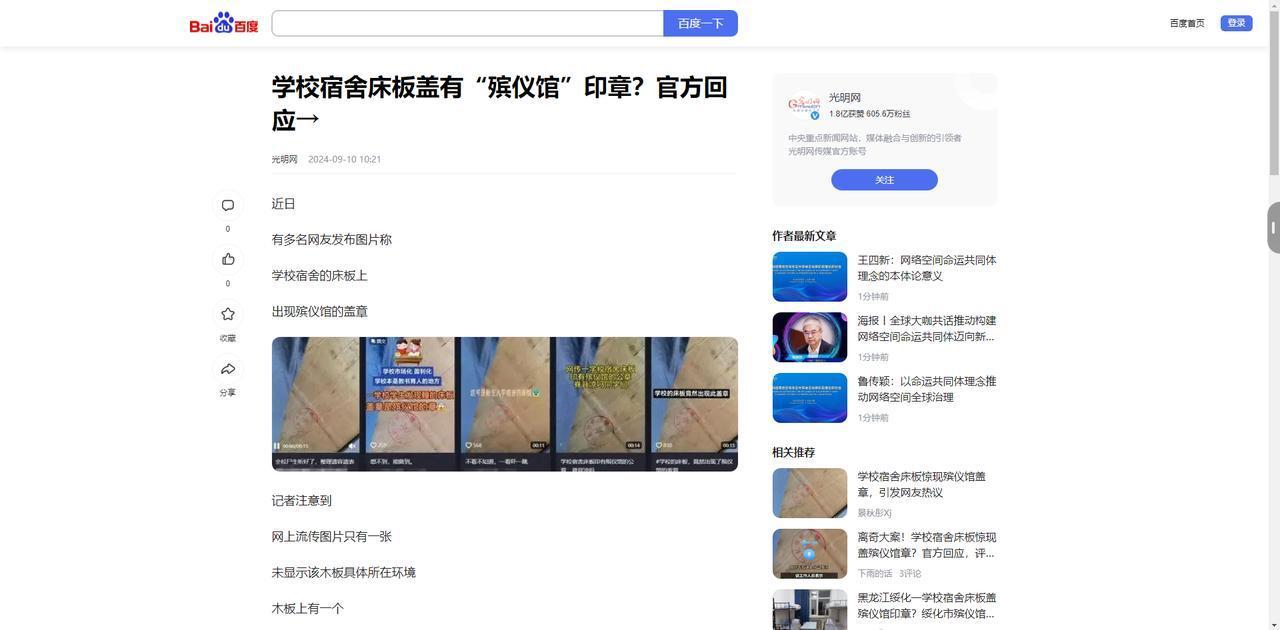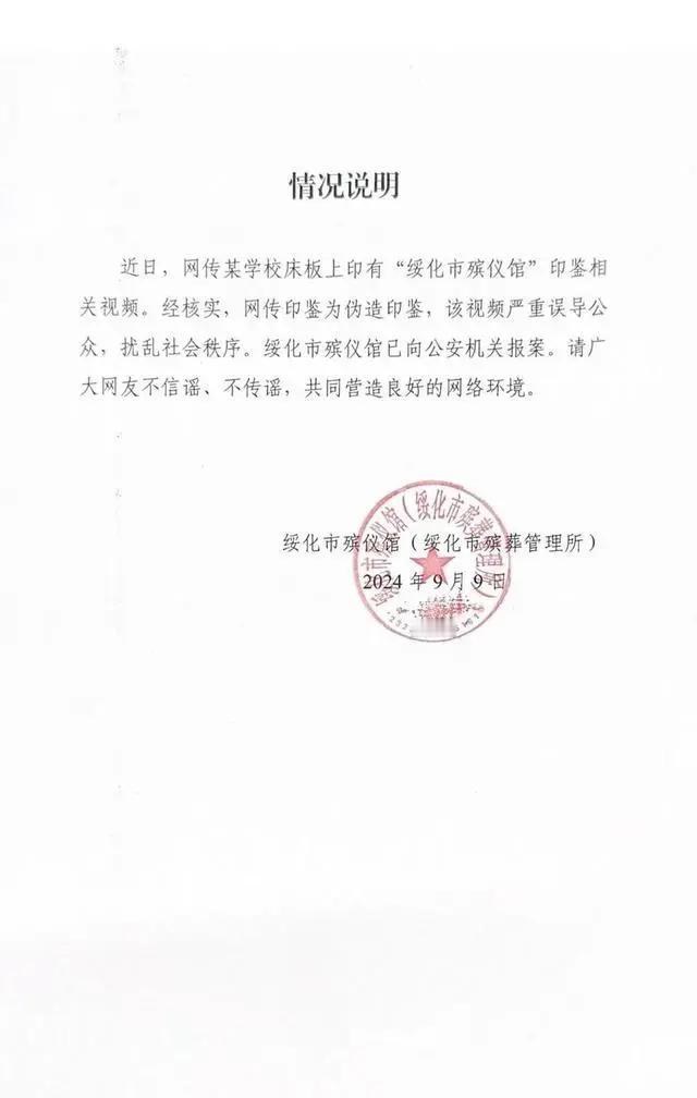 本文信源来自官方媒体【光明网— 学校宿舍床板盖有“殡仪馆”印章?官方回应;界面新闻—学生宿舍床板印有殡仪馆的章?绥化殡仪馆:为伪造印鉴】