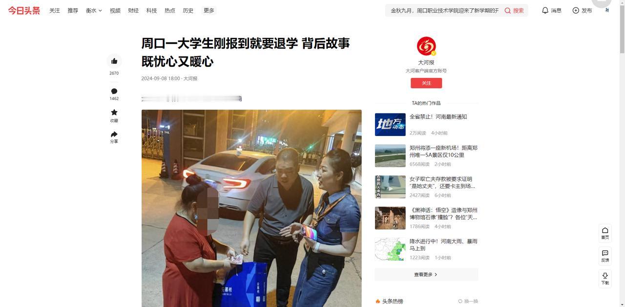 本文信源来自官方媒体【大河报—周口一大学生刚报到就要退学 背后故事既忧心又暖心】